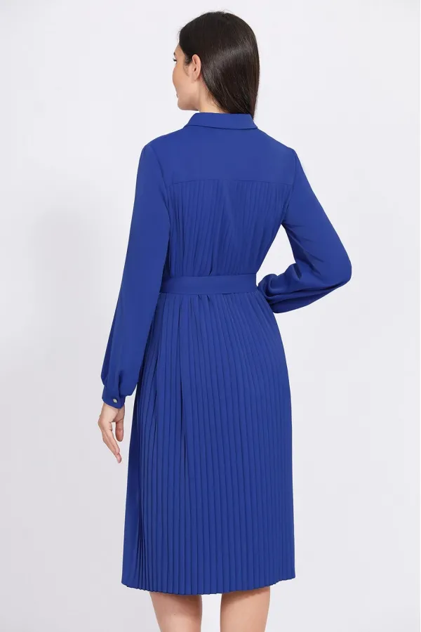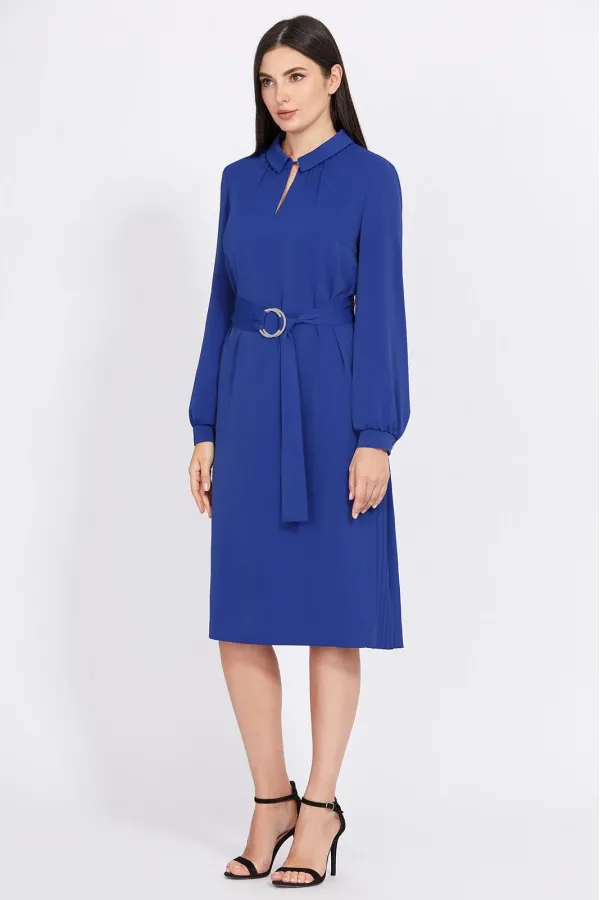 Просто и стильно! Ваш образ будет моментально готов с этим интересным платьем. Модель прямого силуэта выполнили из мягкой, приятной, однотонной ткани и дополнили щелевидным вырезом со сборкой по горловине, отложным воротником с застёжкой на навесную петлю и ювелирную пуговицу, функциональными карманами в боковых швах и деталью со складками по спинке, предоставляющую вам массу свободы и стиля. Рукава втачные, сосборенные по низу манжетами, с застёжкой на ювелирные пуговицы. Для создания приталенного силуэта, предусмотрен интересный пояс в тон, красиво подчёркивающий талию.