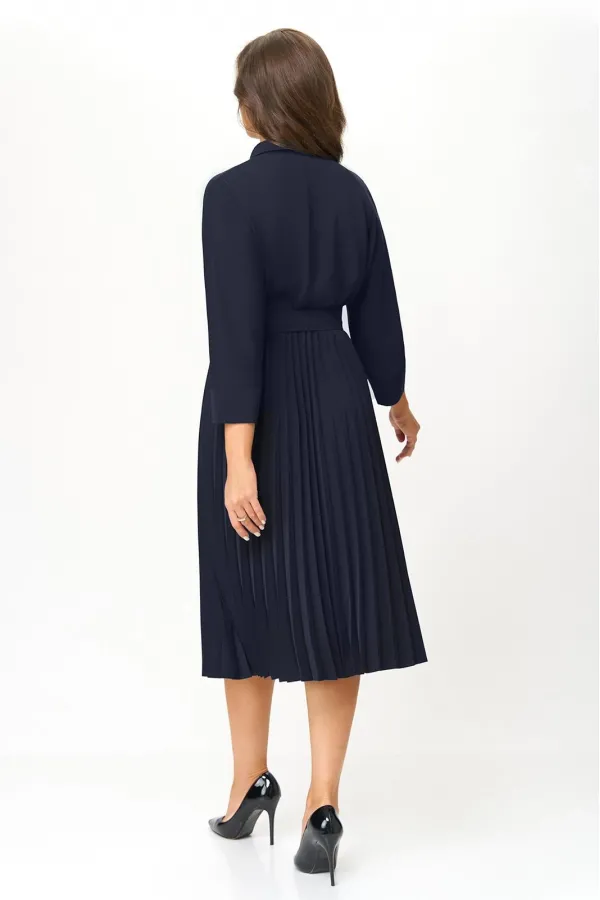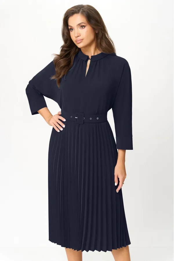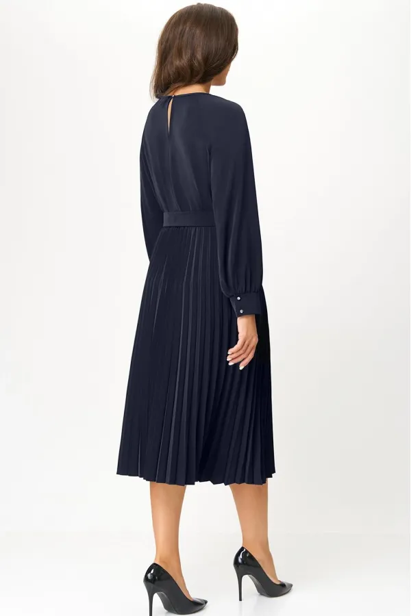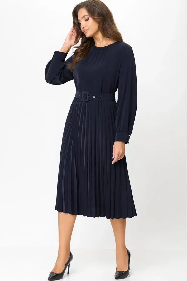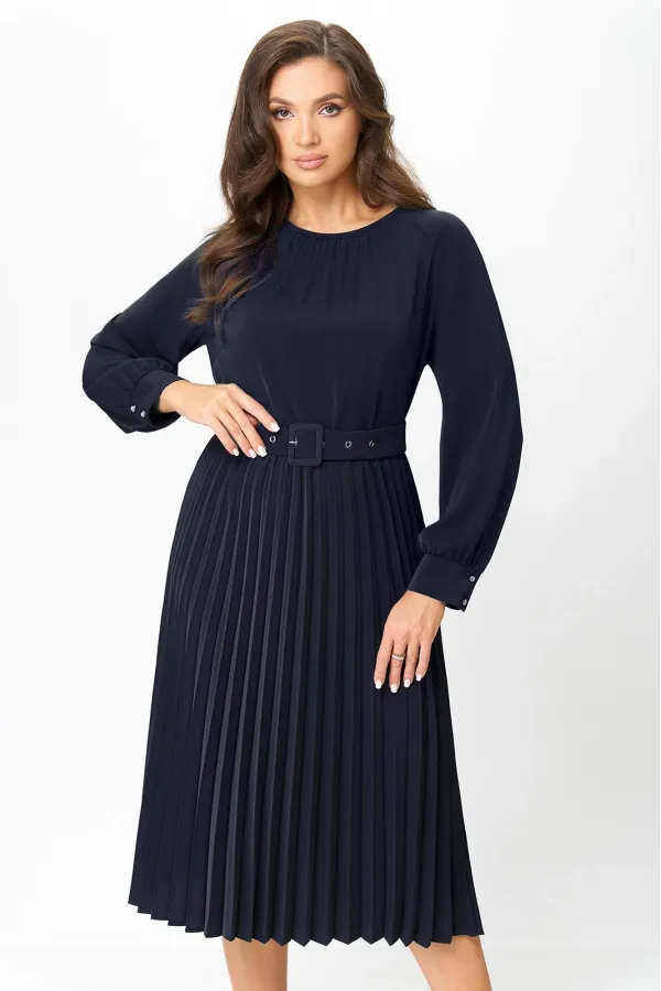 Это красивое платье, идеально подходящее для любого типа фигуры – безупречное предложение для тех женщин, которые любят оригинальную элегантность. Изделие сшили из мягкой, приятной, немнущейся ткани. Модель Х-образного силуэта длины миди, с округлой формой горловины со сборкой по переду и рукавами-реглан, сосборенными по низу манжетами и застёгивающимися на ювелирные пуговицы. В среднем шве спинки лифа обработана застёжка на навесную петлю и пуговицу. Платье привлекает к себе внимание также благодаря плиссированной юбке, придающей фигуре изящные движения. Линия талии акцентирована скрытой резинкой и красиво подчёркнута поясом с пряжкой в тон.