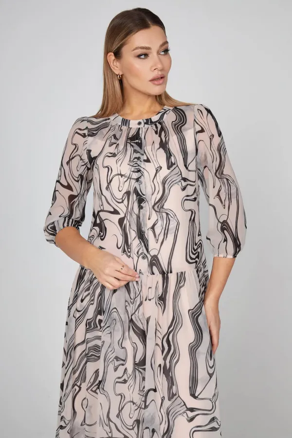 Современное и женственное! Это струящееся свободное платье длины мидакси из польского шифона с щедро расклешенной юбкой обладает очаровательной легкостью. Вместе с интересным абстрактным принтом оно придает особый дух, подчеркивающий Вашу индивидуальность. Модель, с центральной застёжкой на петли и пуговицы, декоративной планкой по горловине со сборкой по переду и укороченными полупрозрачными рукавами, сосбореными по низу эластичной тесьмой и дополненные небольшой сборкой по окату, имеет подкладку из 100% вискозы, благодаря которой Вы будете чувствовать себя комфортно. Идеально подходит для модных образов!