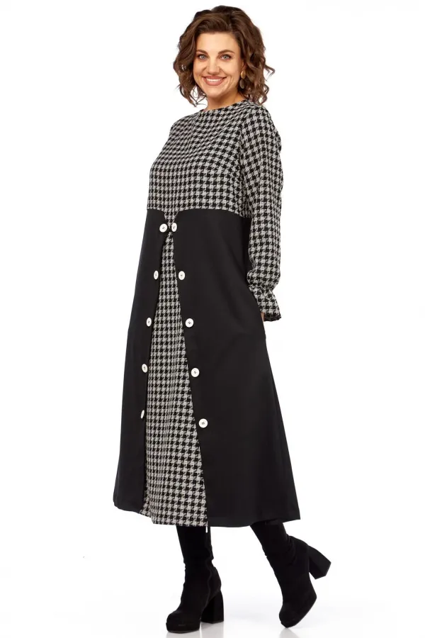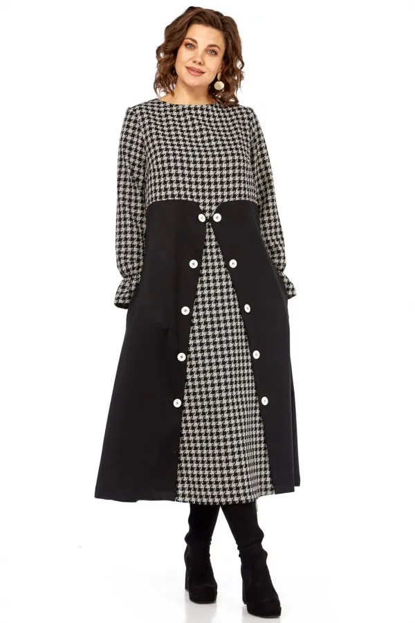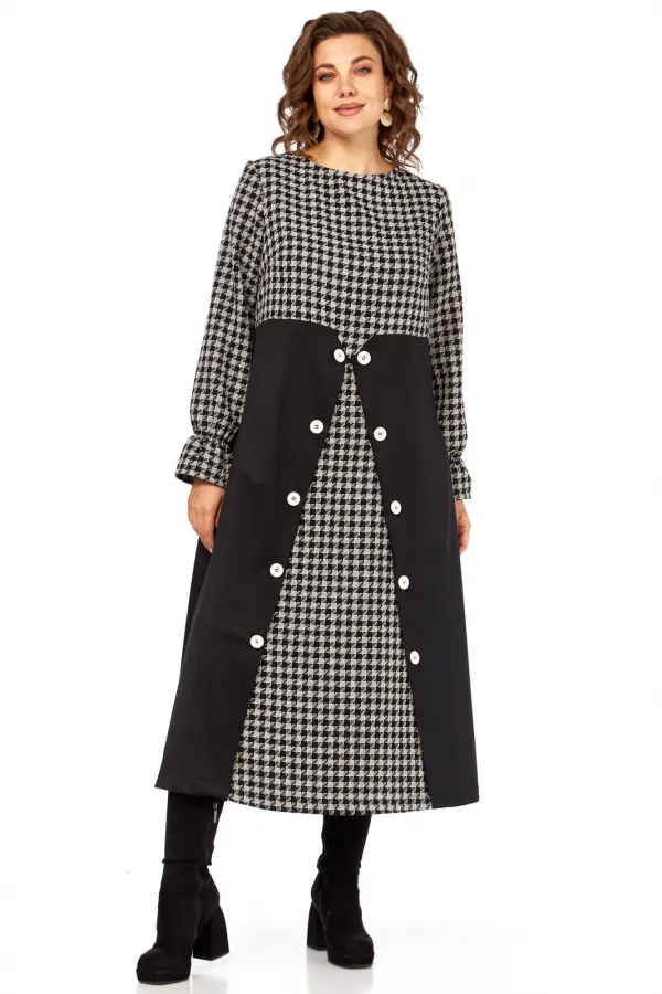 Вечная классика, которая всегда в моде, в платье «Шарм Одри». Платье имитирует сочетание стильного топа с принтом «гусиная лапка» и элегантной юбки-пальто. Это создает эффект многослойности и делает образ более глубоким и интересным, при этом являясь единым цельным нарядом.