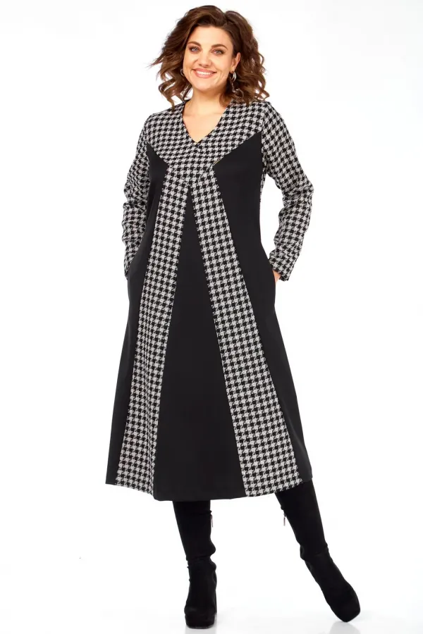 Это платье сочетание классического принта гусиная лапка и смелых черных блоков создает уникальный, запоминающийся образ, который точно соберет комплименты. Продуманное расположение вертикальных черных и принтованных панелей визуально вытягивает силуэт, делая вас стройнее и выше. V-образный вырез дополнительно подчеркивает изящество шеи. Благодаря свободному А-силуэту и длине миди, это платье идеально подходит для активного дня – от деловых встреч до культурных мероприятий. Оно одинаково стильно смотрится с каблуками, ботильонами или даже кедами. Это уверенный, строгий и одновременно харизматичный образ для тех, кто предпочитает четкость линий и графическую выразительность, подчеркивающую их индивидуальность и вкус.