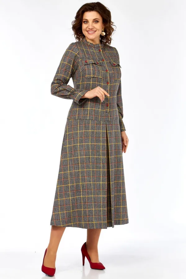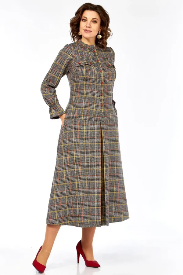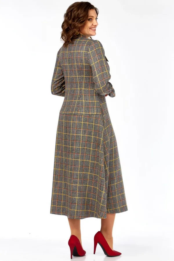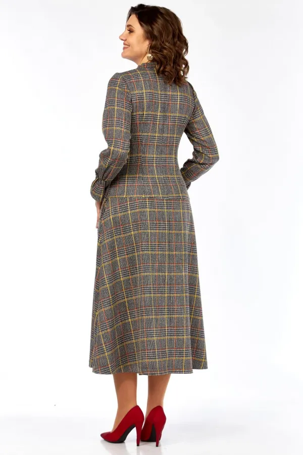Платье А- силуэта в клетку от Celentano. Воротник-стойка, по полочке и спинке идет подрез чуть ниже линии талии, от которого на полочке выполнена встречная складка. Полочка с центральной застежкой на петли-пуговицы, на... Читать далее...