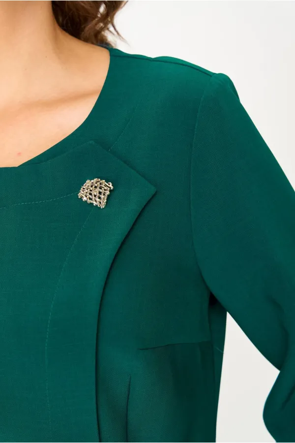 Перед с ассиметричной линией горловины в виде «лодочки» и имитацией запаха. Фигурную линию запаха вверху украшает декоративная пуговица. По низу переда обработана шлица. На линии талии имеются два пояса в виде шнура с наконечниками.