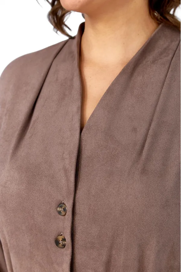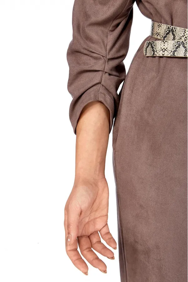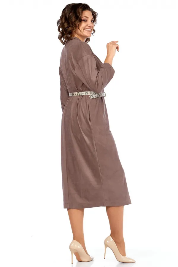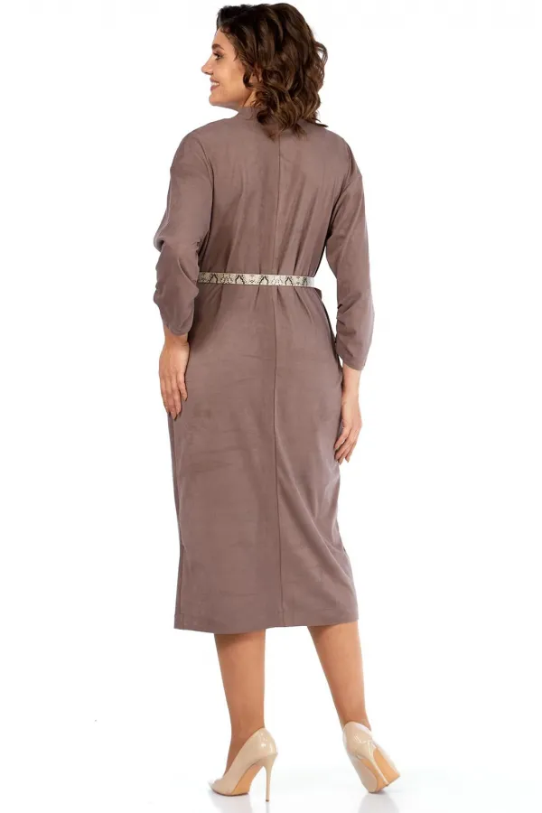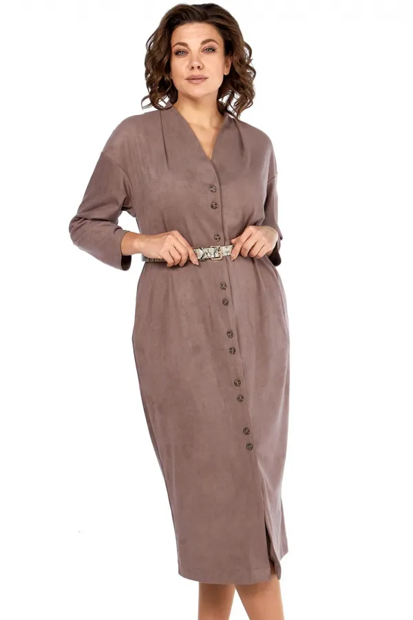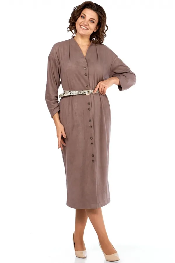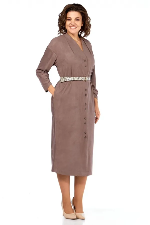 Платье женское поплуприлегающего силуэта с застежкой на петли и пуговицы. Спинка со средним швом. Полочка с мягкой складкой у горловины. Боковые карманы обработаны в швах с частично настроченной мешковиной. Рукав со спушенной линией плеча, втачной, одношовный с 3-мя мягкими складками снизу. Воротник-стойка цельнокройная с полочкой. В комплекте ремень из эко-кожи. Фурнитура может отличаться от заявленной на фото.