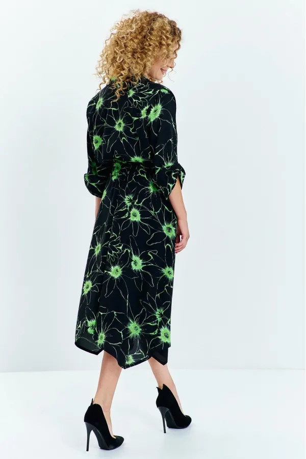 Платье женское выполнено в романтичном стиле, полуприлегающего кроя. Изделие отрезное по линии талии с регулирующей эластичной лентой в талии. Лиф платья свободного кроя с декоративными защипами и заложенными складками по талии и плечам. Рукав втачной приспущенный широкий с манжетой по низу. Юбка полусолнце с ассиметричным низом, в боковых швах юбки расположены фигурные карманы.Модель подходит на рост 164-170