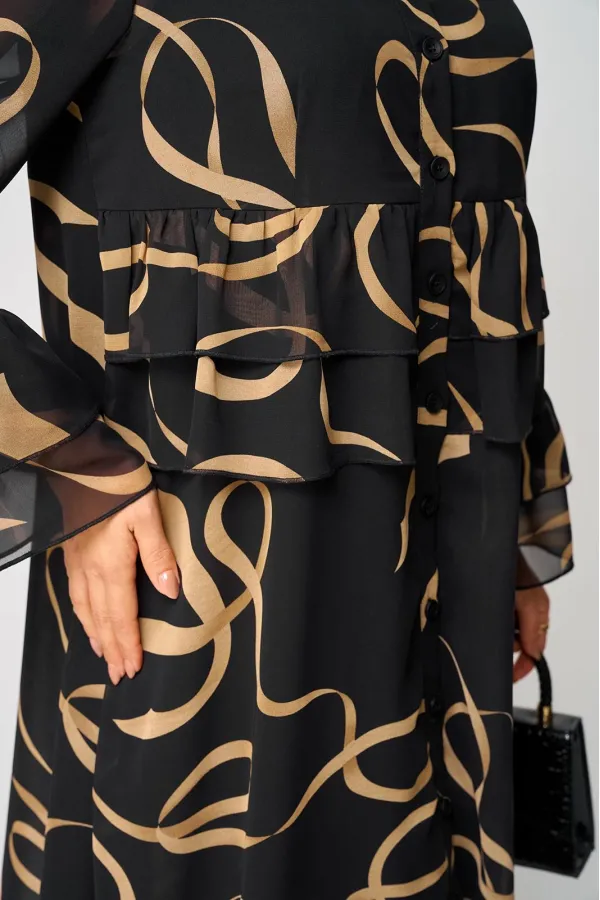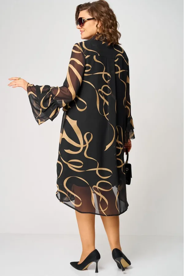 Платье женское нарядное свободного силуэта на подкладке, выполнено из шифона с принтом. Застежка доверху на петли и пуговицы, воротник на стойке рубашечного типа, рукав втачной с приточными воланами со сборкой. По спинке... Читать далее...