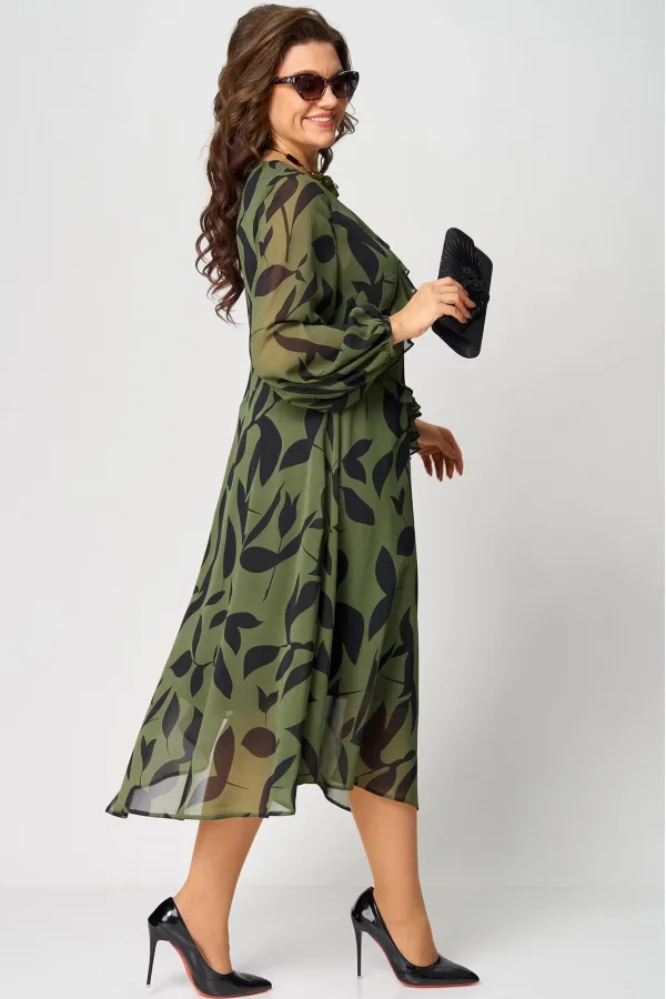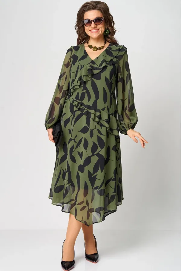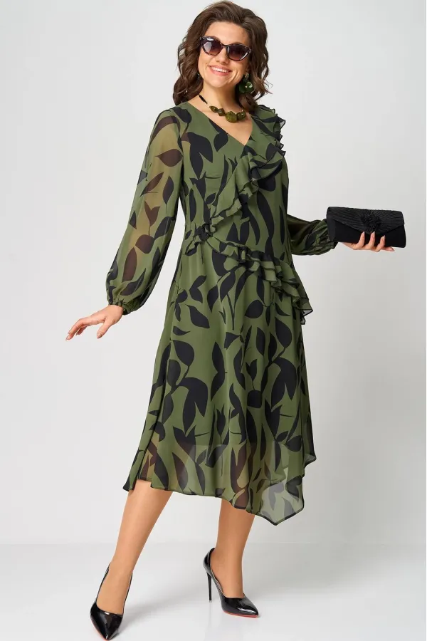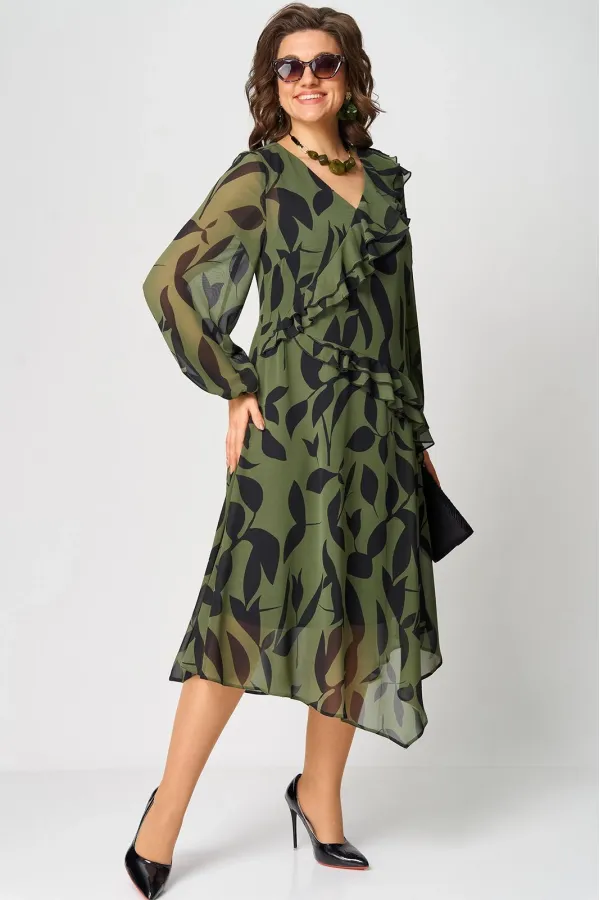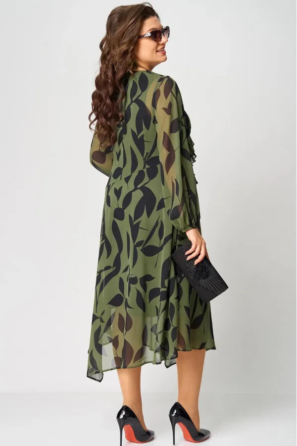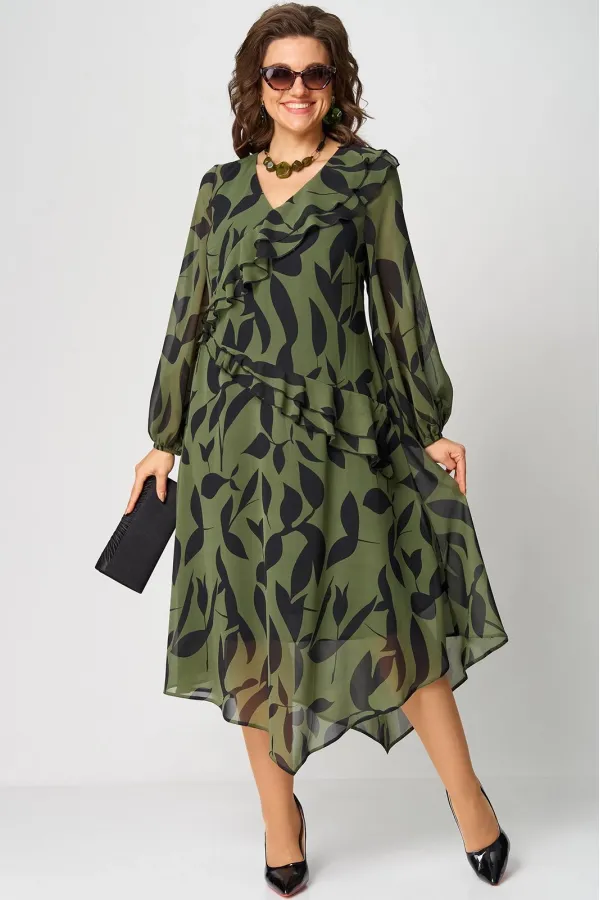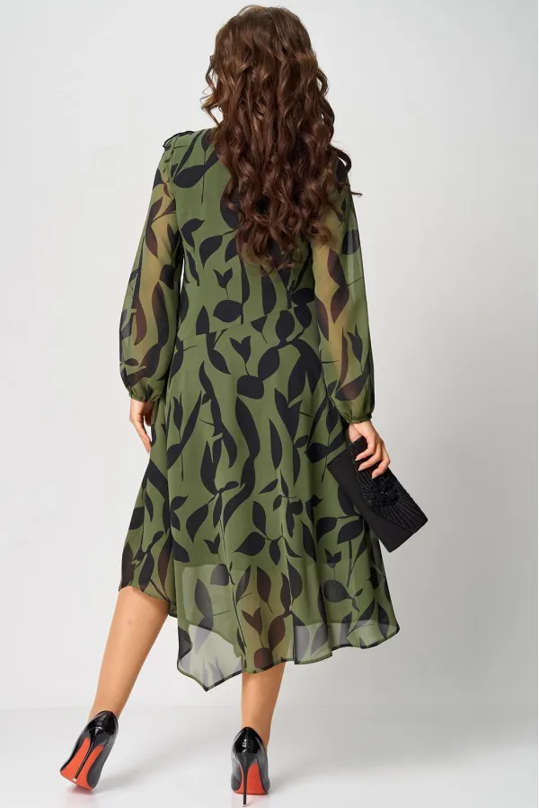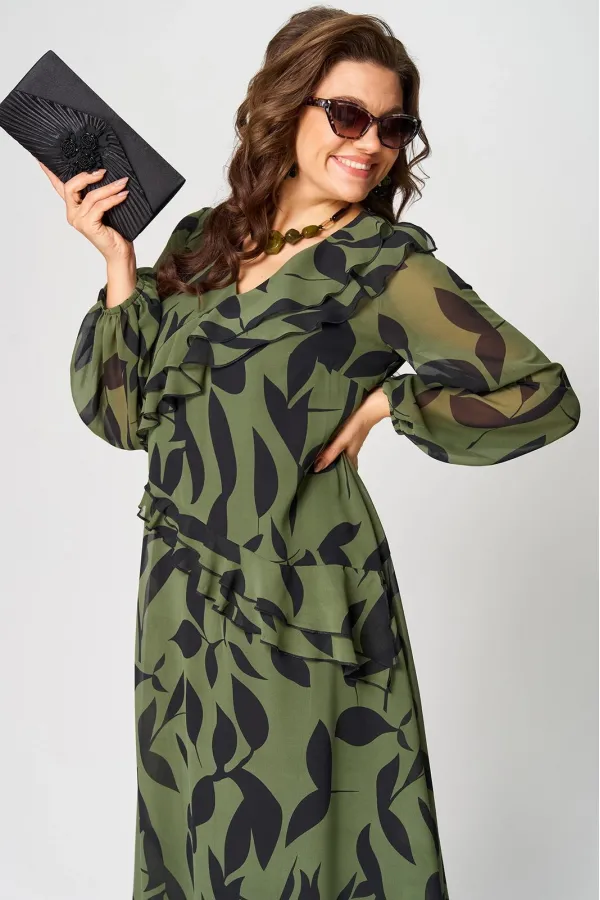 Платье женское нарядное полуприлегающего силуэта на трикотажной подкладке расширенное к низу выполнено из шифона. Вырез горловины V-образный, рукав втачной по низу собран на резинку. По полочке нагрудные вытачки и фигурные подрезы с двойными воланами. Низ платья фигурный. Декором платья служат воланы и дизайн самой ткани.