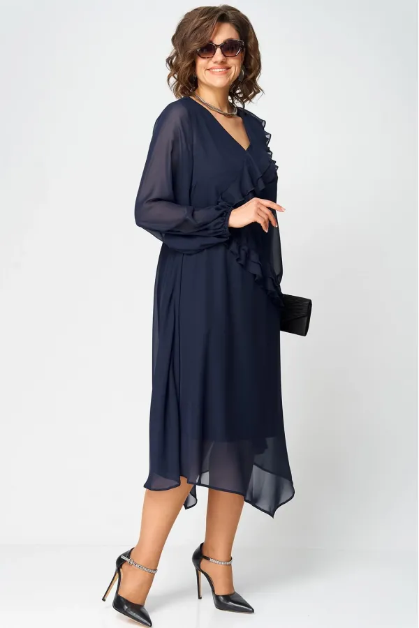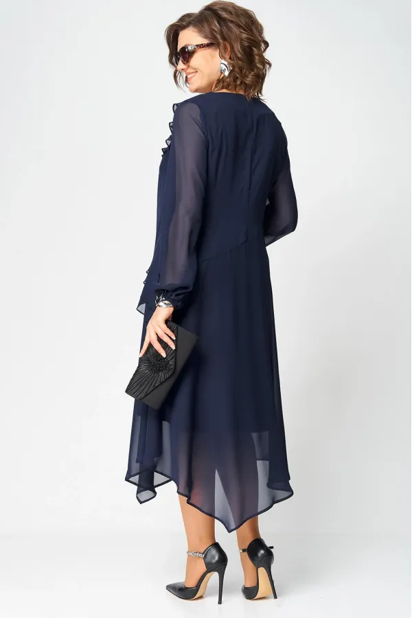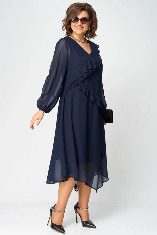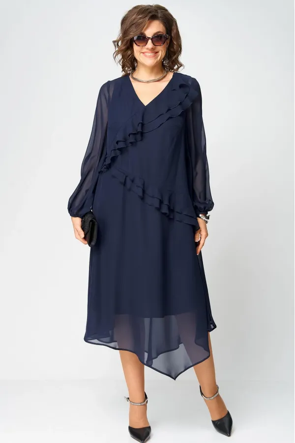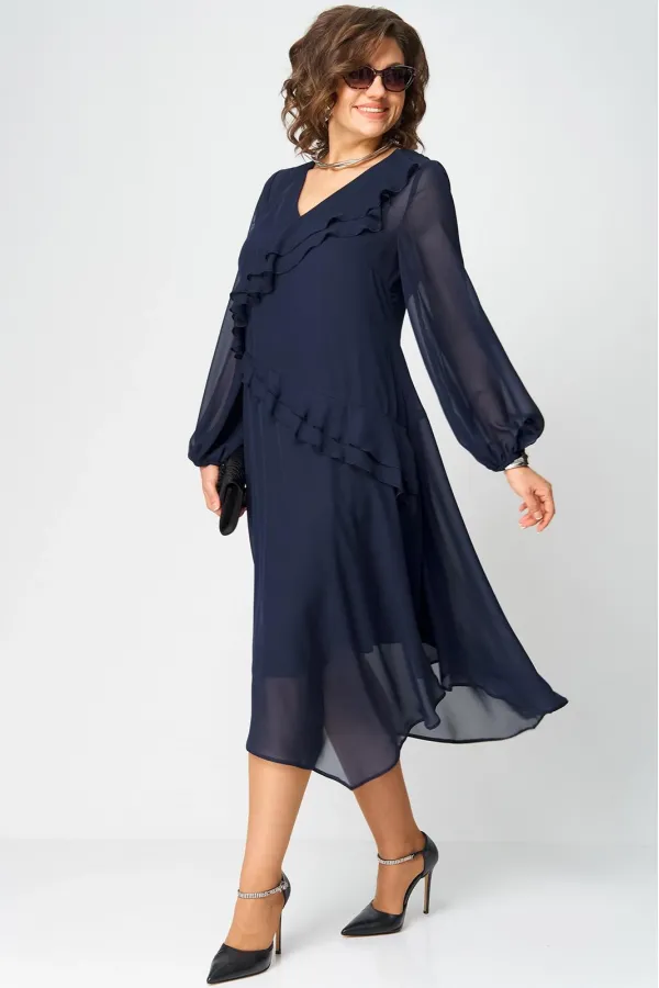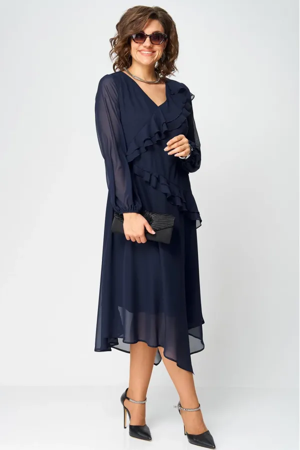 Платье женское нарядное полуприлегающего силуэта на трикотажной подкладке расширенное к низу выполнено из шикарного шифона. Вырез горловины V-образный, рукав втачной по низу собран на резинку. По полочке нагрудные вытачки и фигурные подрезы с двойными воланами. Низ платья фигурный. Декором платья служат воланы и дизайн самой ткани.