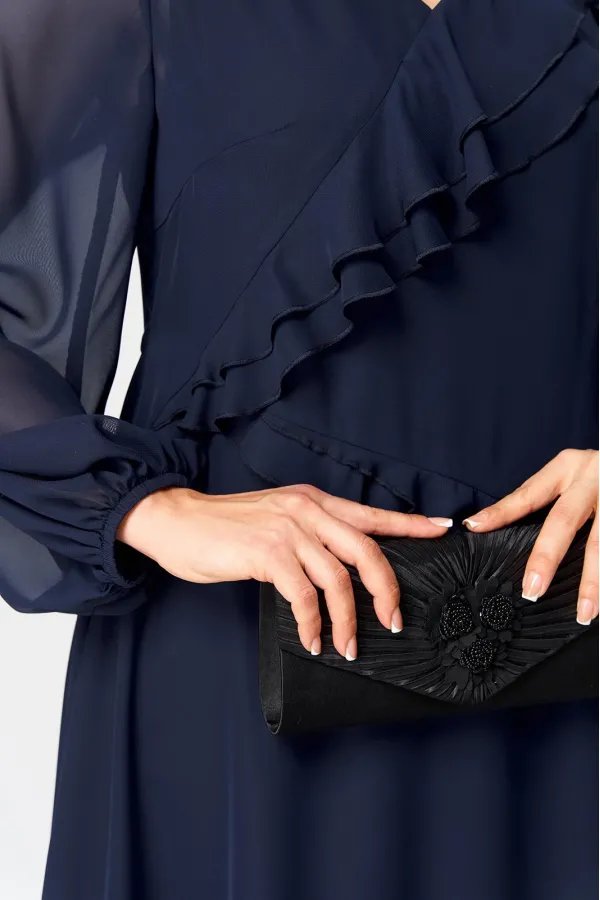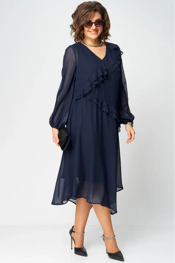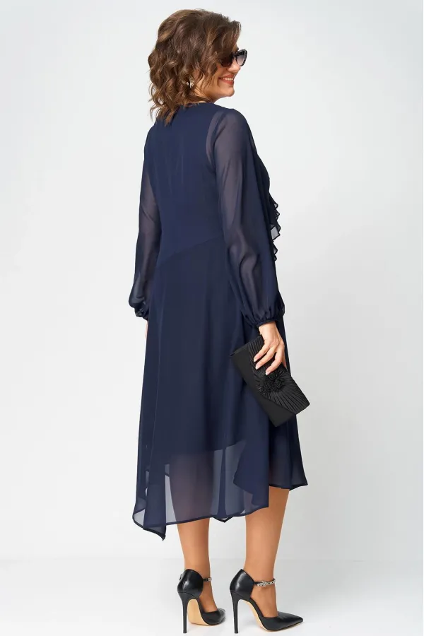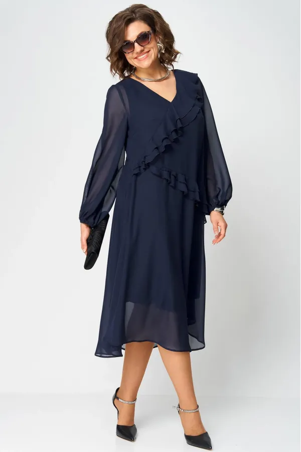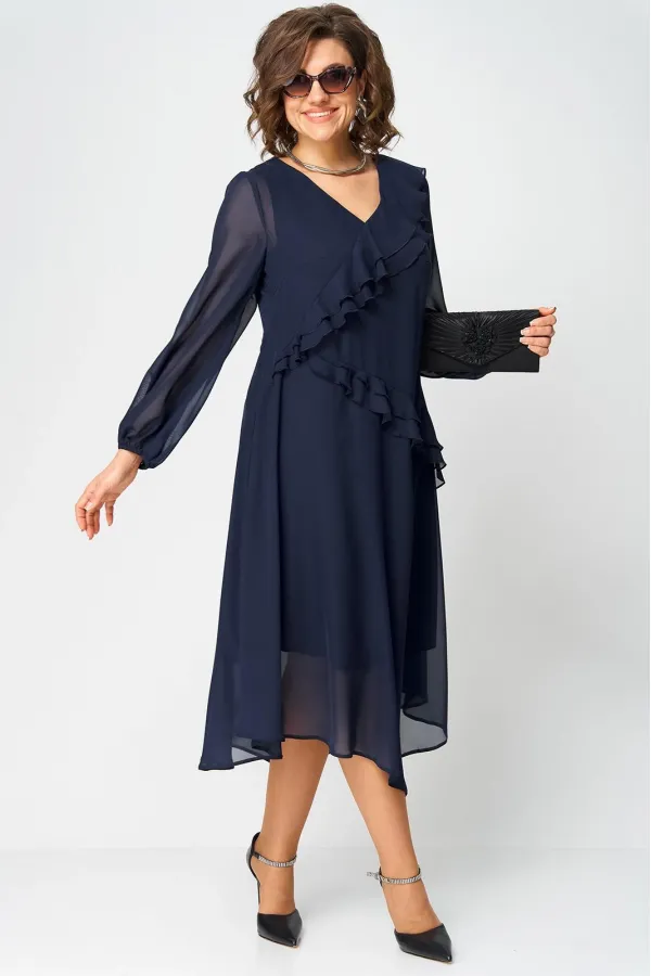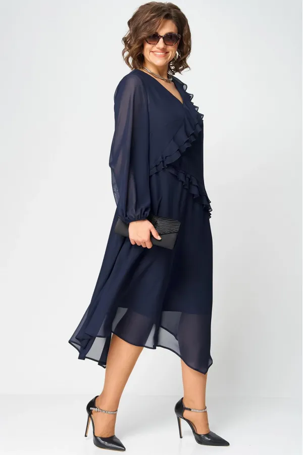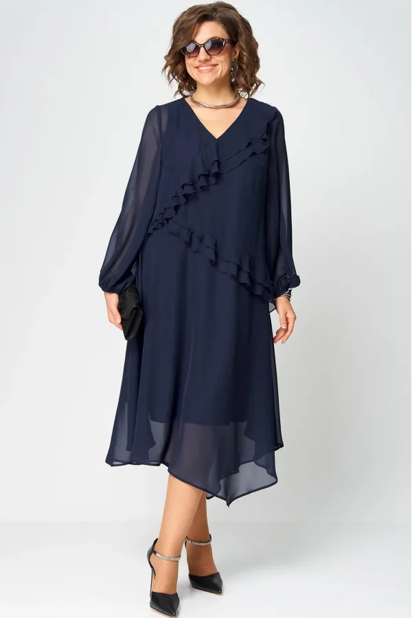 Платье женское нарядное полуприлегающего силуэта на трикотажной подкладке расширенное к низу выполнено из шикарного шифона. Вырез горловины V-образный, рукав втачной по низу собран на резинку. По полочке нагрудные вытачки и фигурные подрезы с двойными воланами. Низ платья фигурный. Декором платья служат воланы и дизайн самой ткани.