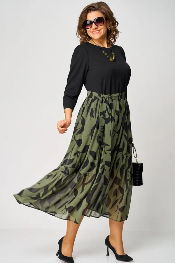 Платье женское нарядно-повседневное полуприлегающего силуэта до талии. Выполнено из трикотажного полотна в сочетании с шифоном. Вырез горловины круглый на обтачке. По спинке застежка капелька на навесную петлю и пуговицу. Рукав втачной 7/8 по верху со встречной складкой. Платье отрезное по талии, верх из трикотажного полотна , низ платья юбка со сборкой. декором платья служит съемный пояс в цвет юбки.