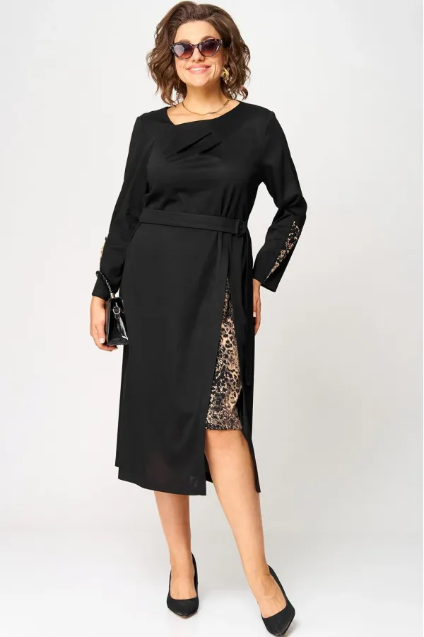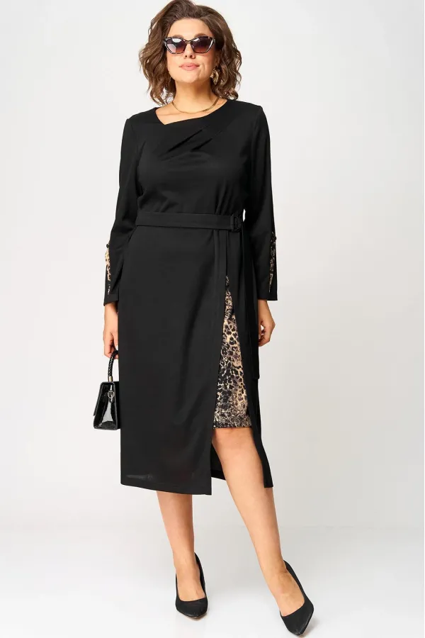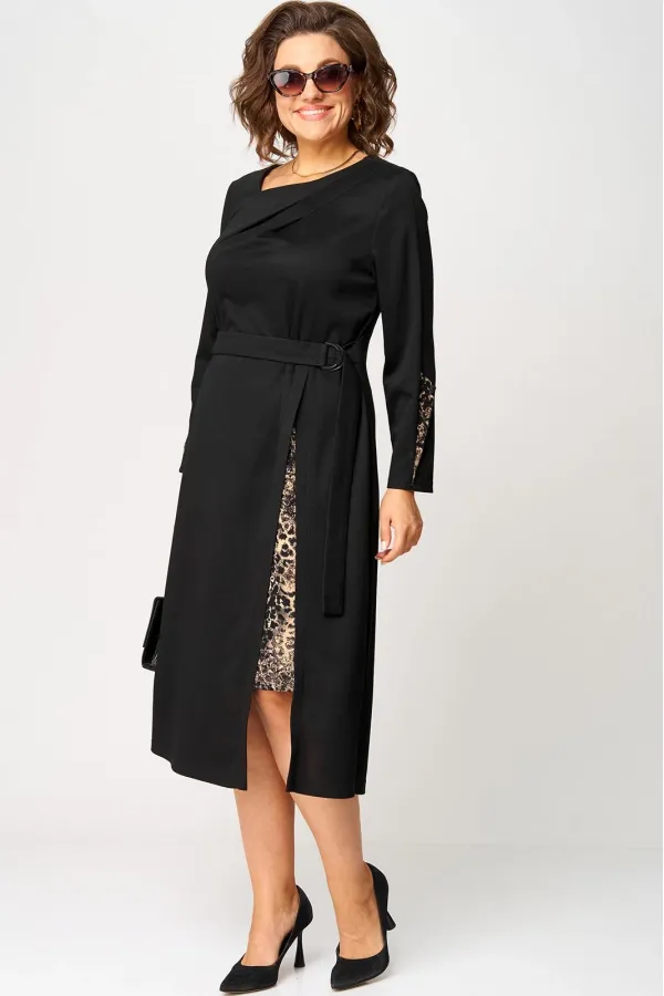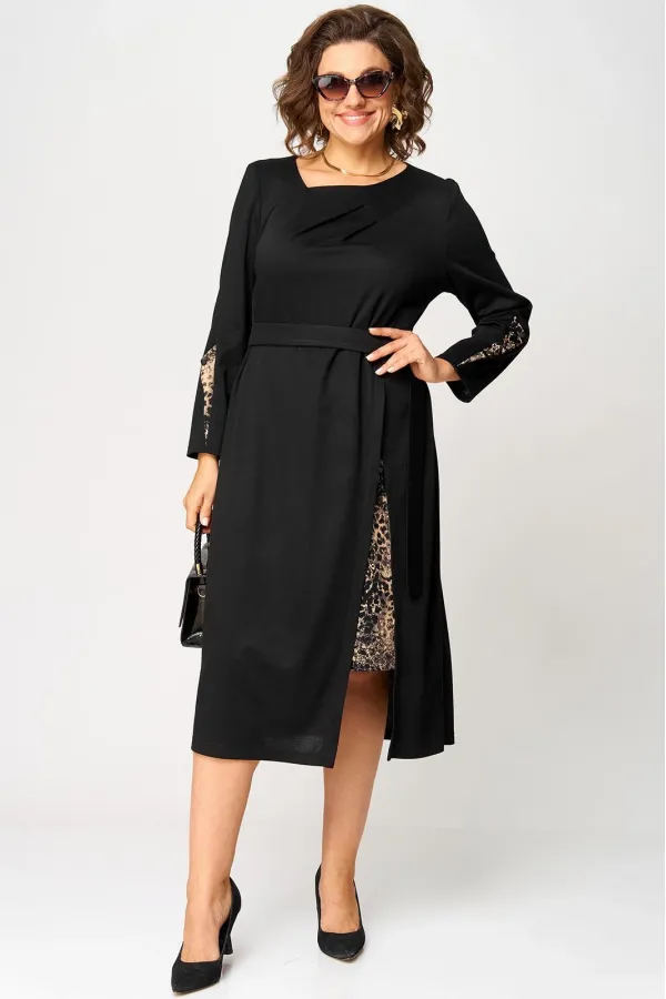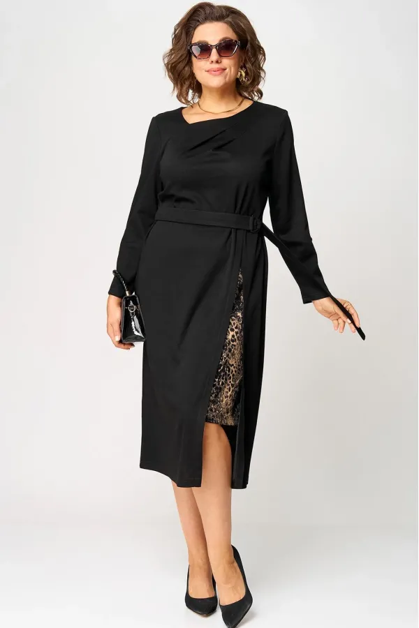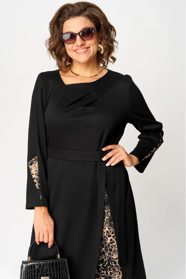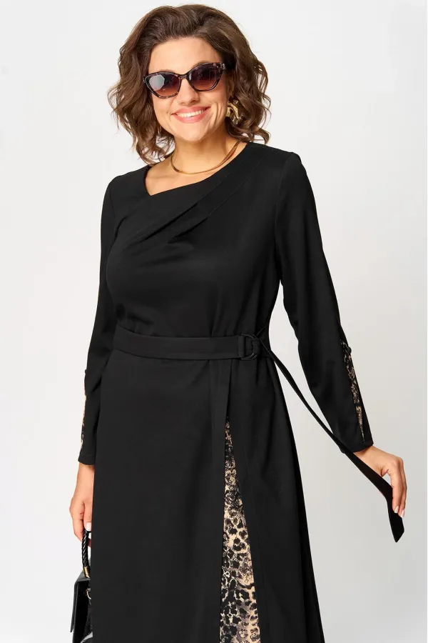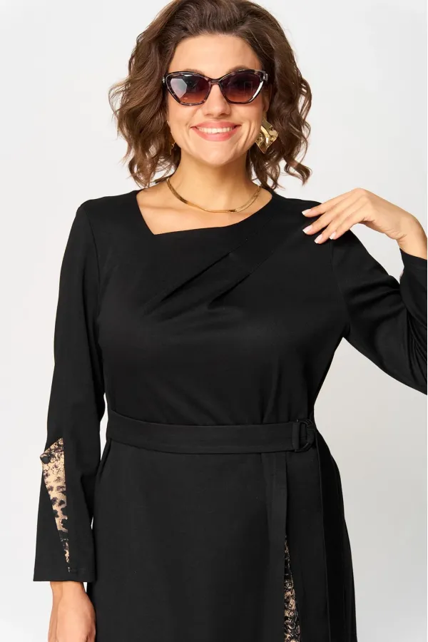 Платье женское повседневное полуприлегающего силуэта, выполнено из трикотажного полотна в сочетании с отделкой. Вырез горловины V-образный на обтачке. Рукав втачной 7/8 по низу на притачной манжете из отделочной ткани. По переду платье с выточками и отрезными ассиметричными элементами из отделочной ткани. По центру платья обработан небольшой разрез. Декором служит съёмный пояс из основной ткани.