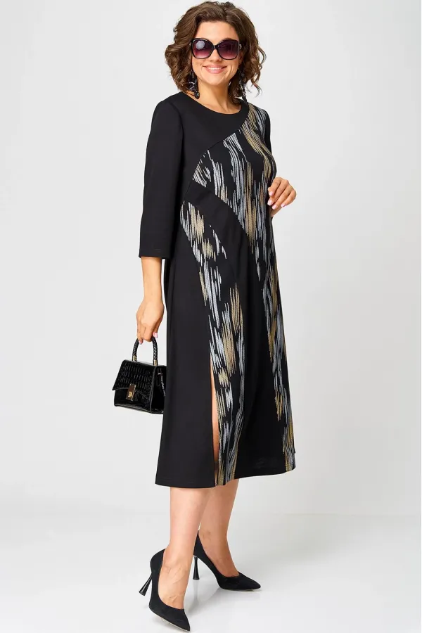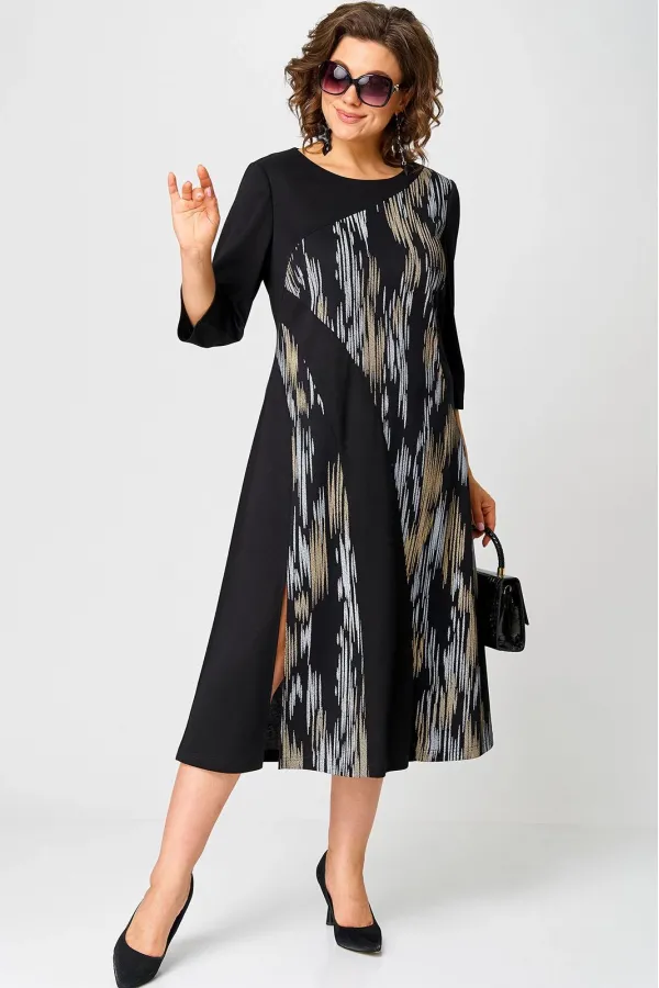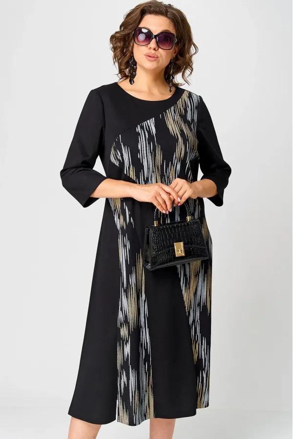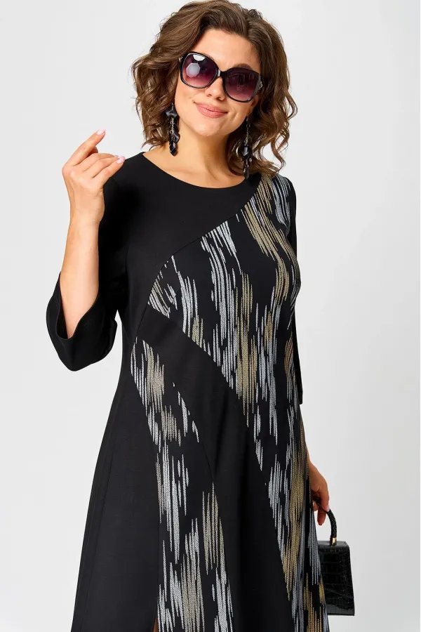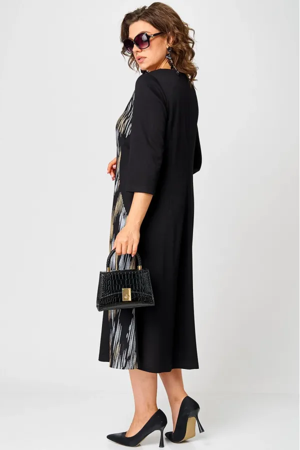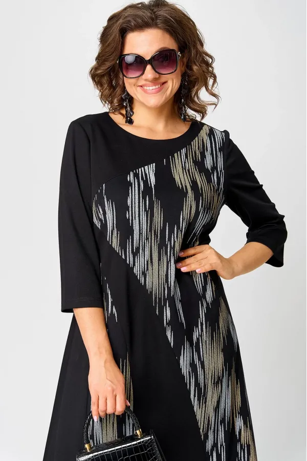 Платье женское повседневное полуприлегающего силуэта расширенное к низу, выполнено из трикотажного полотна двух дизайнов. Вырез горловины круглый на обтачке. Рукав втачной 3/4. Спинка платья выполнена из однотона, полочка с отделочными вставками из цветного трикотажа. В одном боковом шве обработан разрез. Декором платья служат вставки из отделочного трикотажа.