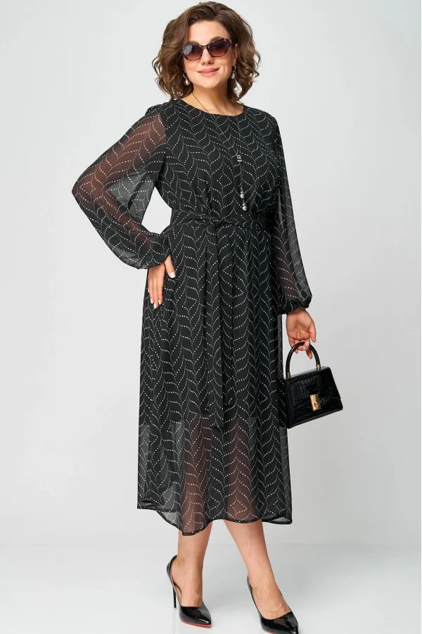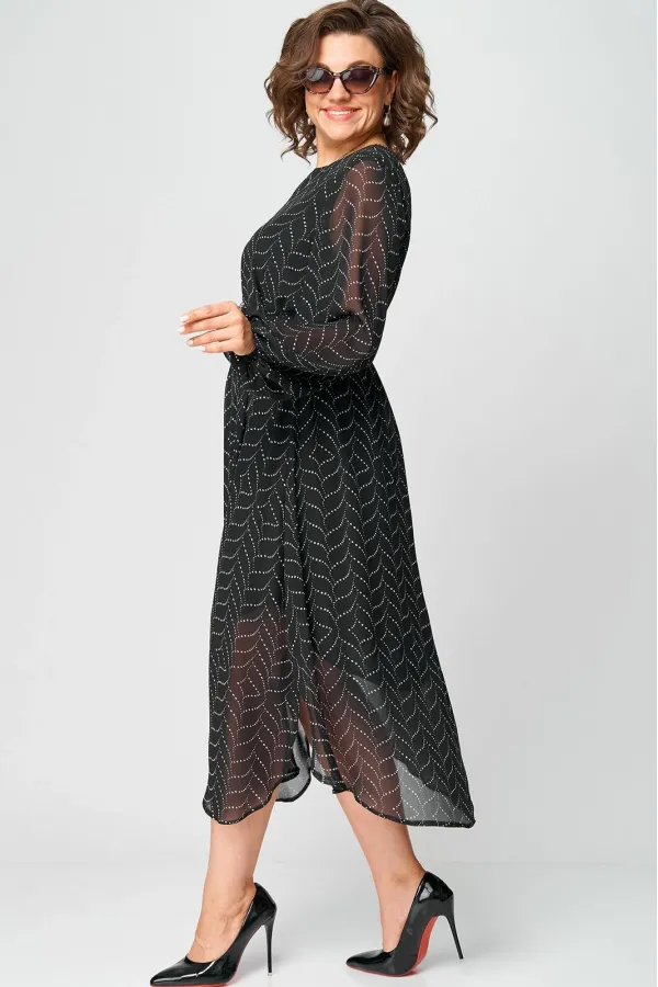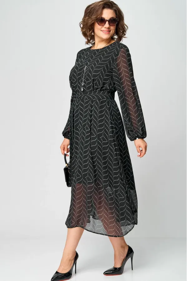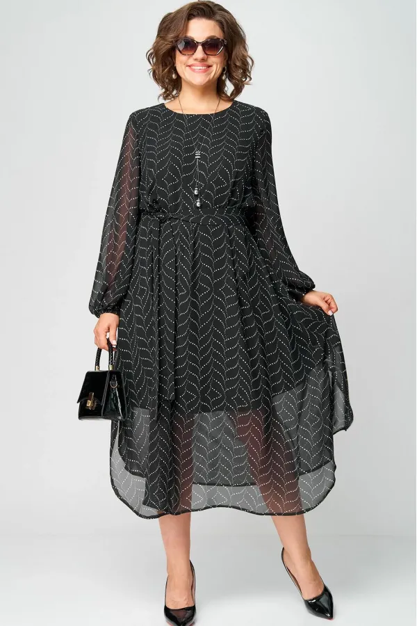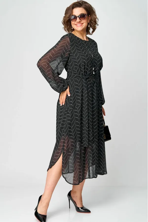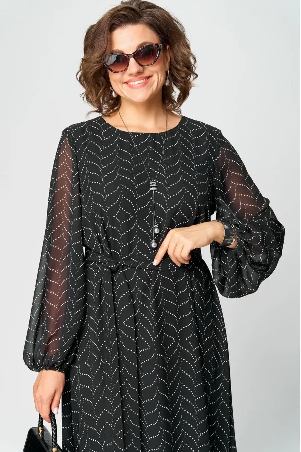 Платье женское нарядно-повседневное А-образного силуэта, выполнено из креп-шифона. Платье на трикотажной подкладке. Вырез горловины круглый на обтачке, по спинке застежка на навесную петлю и пуговицу. Рукав втачной по низу собран на резинку. В боковых швах обработаны разрезы, низ платья фигурный. Декором платья служит принт самой ткани. Пояс в комплекте.