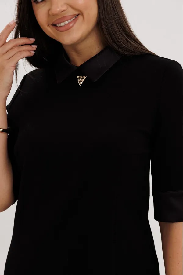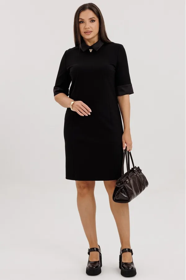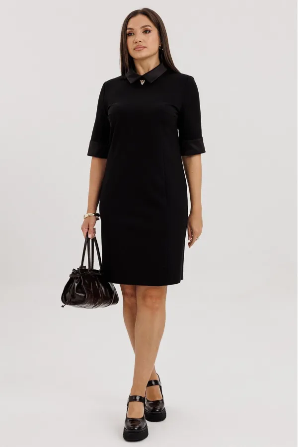 Детали: длина до колена, рукав ¾, строгий воротник с акцентной деталью.