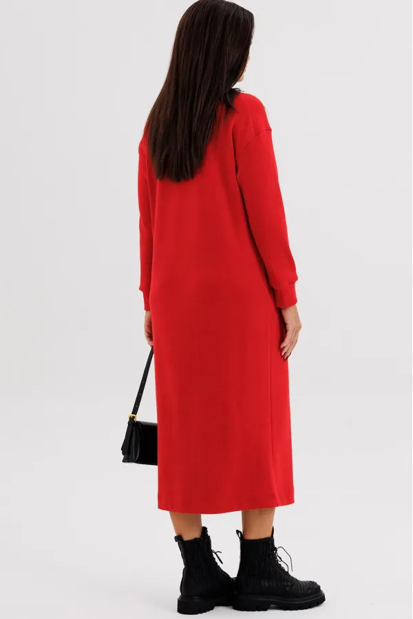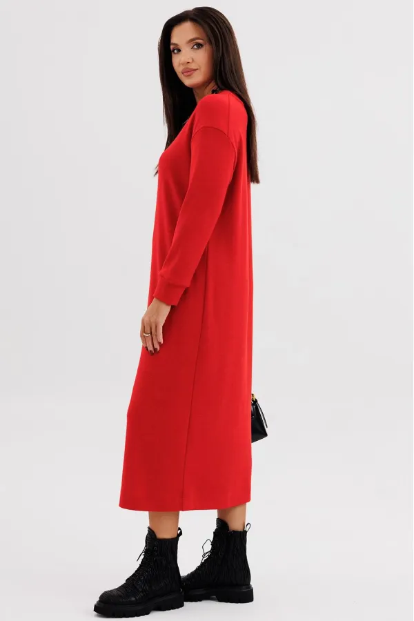 Мягкая фактура ткани приятна к телу и подходит для любого сезона. Насыщенный красный цвет подчёркивает женственность и уверенность, а минималистичный стиль позволяет комбинировать платье с различными аксессуарами и обувью — от классических туфель до ботильонов.