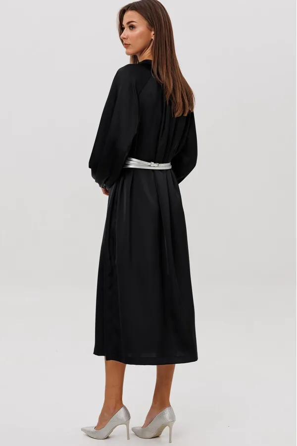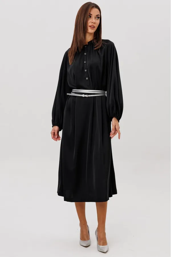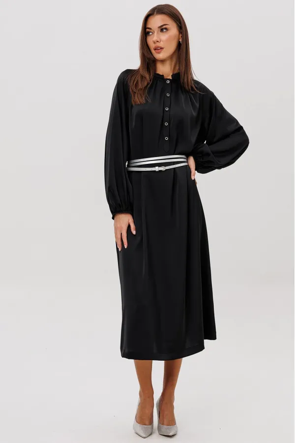 Платье из гладкого атласного полотна свободного рубашечного покроя. Модель выполнена с мягкой сборкой по горловине, застёжкой на пуговицы и объёмными рукавами на манжете. Акцентом выступают эффектные серебристые пояса, подчёркивающие талию и добавляющие образу современный, элегантный штрих. Ideal для деловых встреч, ужинов и особых выходов.