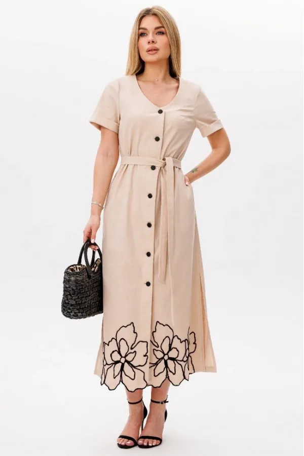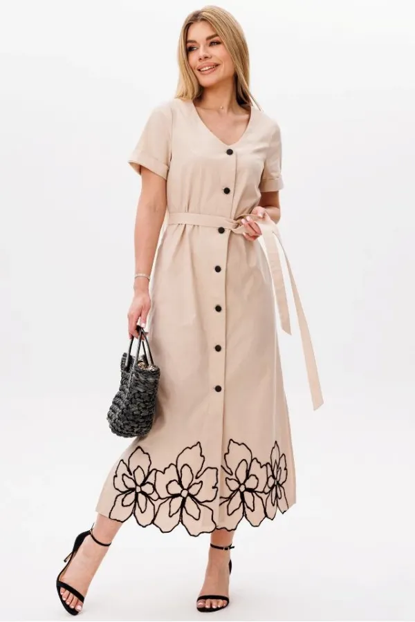 Силуэт: Свободный Вырез горловины: округлый Декоративные элементы: вышивка Дополнительное описание: по переду платья- планка на петли и пуговицы. Рукав втачной, с отворотом. Низ платья фигурный, с вышивкой. В боковых ш... Читать далее...
