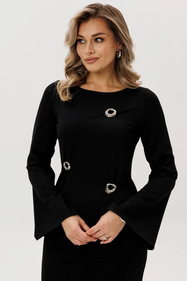 Gлатье из трикотажного полотна с добавлением люрексовой нити. Рукав втачной, расширенный книзу.В комплект входят съемные броши.