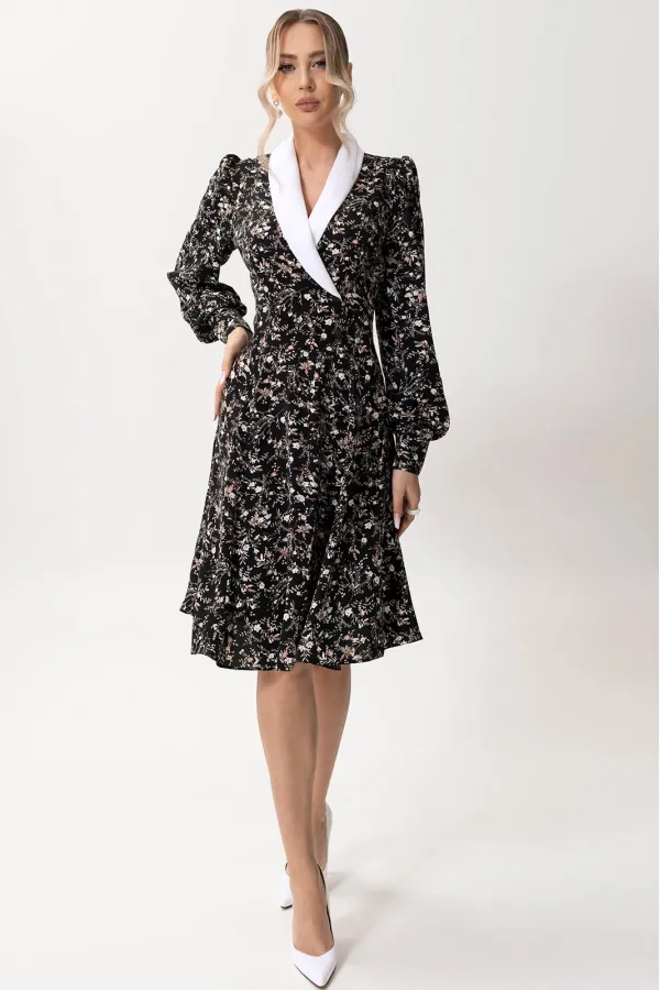 Цветовая гамма для верха, подкладки, фурнитуры, отделки: платье из ткани с цветочным рисунком. Воротник контрастен основной ткани.