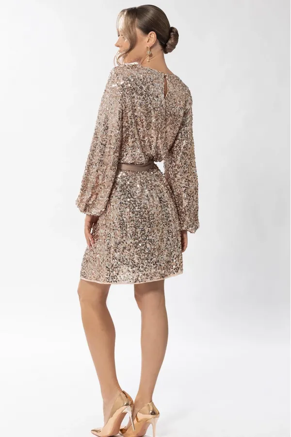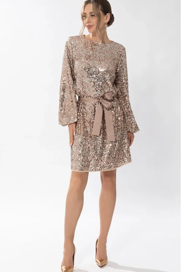 Цветовая гамма для верха, подкладки, фурнитуры, отделки: платье из ткани с пайетками, в одной цветовой гамме.