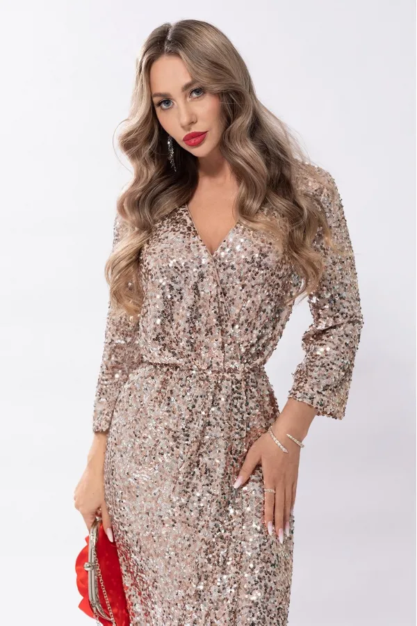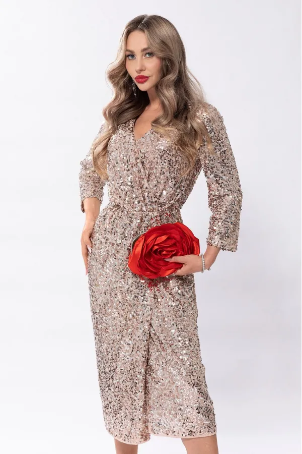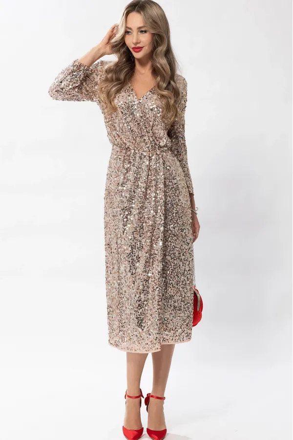 Платье из ткани с пайетками полуприлегающего силуэта, без воротника с V-образным вырезом горловины, с полочками на запах, зафиксированными по линии талии и с застежкой на пришивную кнопку по горловине. Платье отрезное по линии талии По линии талии полочки присборены, также шов по талии присборен на резинку. Рукав втачной, 3/4.