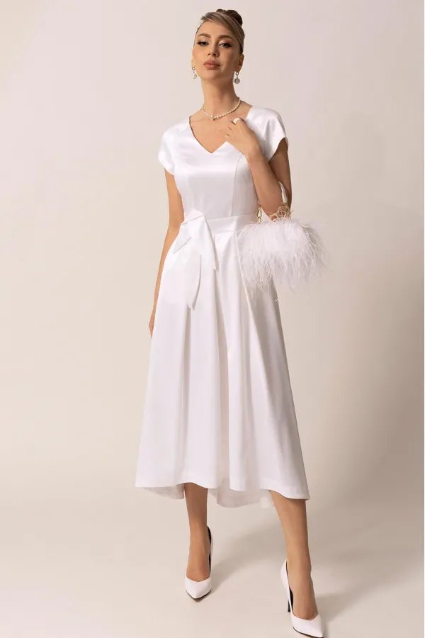 Платье без воротника, с V-образным вырезом горловины, застежкой на потайную молнию в среднем шве спинки. Платье отрезное по линии талии, с втачным поясом. Верхняя часть переда с рельефами, выходящими из проймы. Нижняя часть переда с карманами, входящими в боковой шов, односторонними складками по талии. Спинка со средним швом, по верхней части с рельефами, выходящими из проймы.