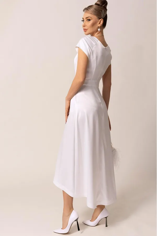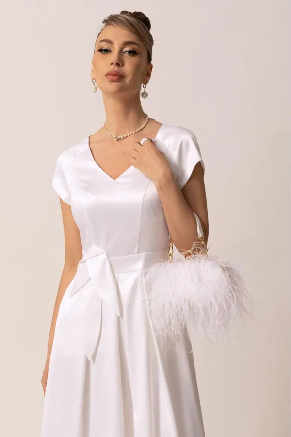 Платье без воротника, с V-образным вырезом горловины, застежкой на потайную молнию в среднем шве спинки. Платье отрезное по линии талии, с втачным поясом. Верхняя часть переда с рельефами, выходящими из проймы. Нижняя ча... Читать далее...