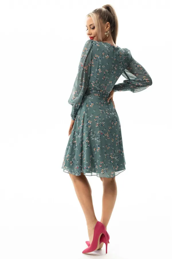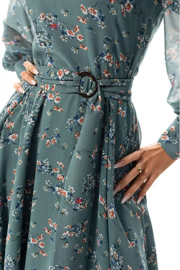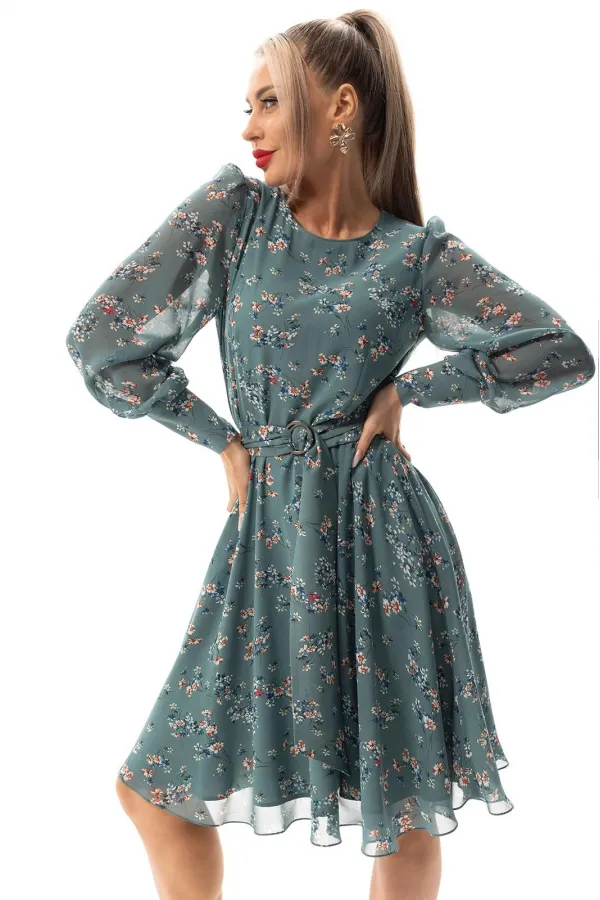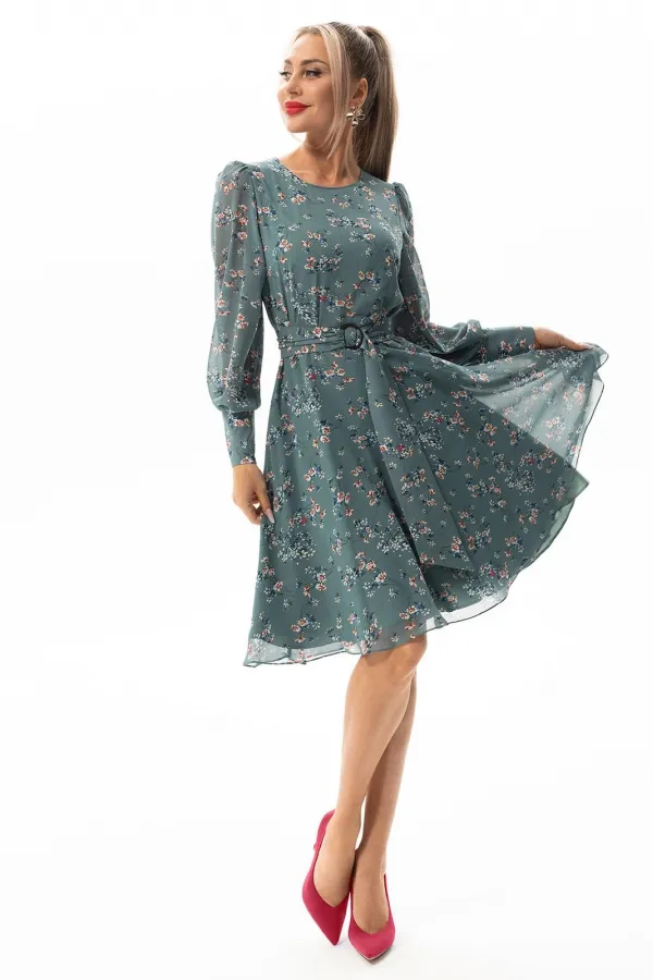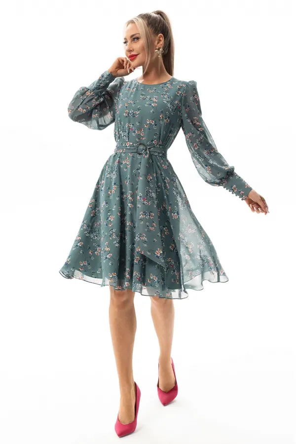 Платье без воротника, с круглым вырезом горловины, застежкой на потайную молнию в среднем шве спинки. Платье отрезное по линии талии. Верхняя часть переда с талиевыми вытачками. Спинка со средним швом, верхняя часть спинки с талиевыми вытачками. Окат рукава присборен. Платье со съемным поясом.