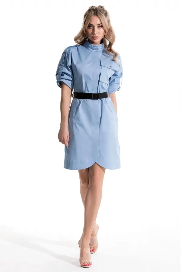 Платье с центральной потайной застежкой на петли и пуговицы, втачным воротником- стойкой. На стойке расположена пата со шлевками. По переду на уровне груди один накладной карман с клапаном, на уровне линии бедер – прорезные карманы с листочкой. Рукав втачной, плечо спущенное. На плечевых швах расположена пата, закрепляющая отворот рукава, пата закреплена к плечевому шву кнопкой. Линия низа фигурная. Платье со съемным поясом. На боковых швах- шлевки для закрепления пояса. Цветовая гамма для верха, подкладки, фурнитуры, отделки: платье из ткани в одной цветовой гамме. Комплектация: платье без подкладки.