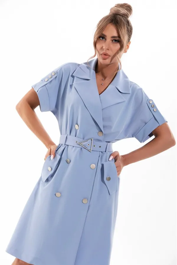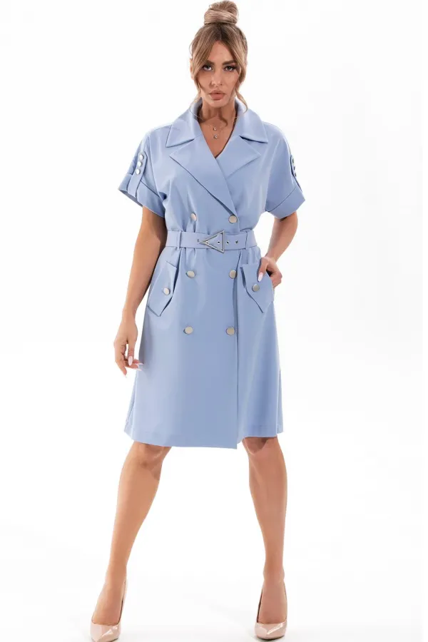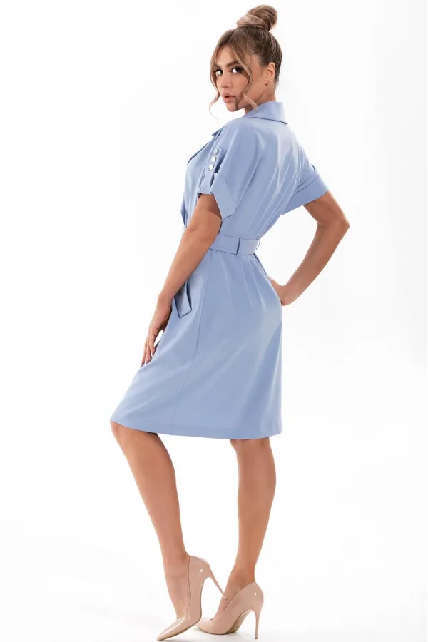 Описание внешнего вида: Платье с центральной двубортной застежкой на петли и пуговицы, втачным воротником и отложными лацканами. На уровне линии бедер прорезные карманы с клапанами, зафиксированные к платью петлей и пуговицей. Рукав цельнокроенный, с притачной манжетой и патой, зафиксированной к плечевому шву петлями и пуговицами. Платье со съемным поясом. Цветовая гамма для верха, подкладки, фурнитуры, отделки: платье из ткани в одной цветовой гамме. Комплектация: платье на подкладке