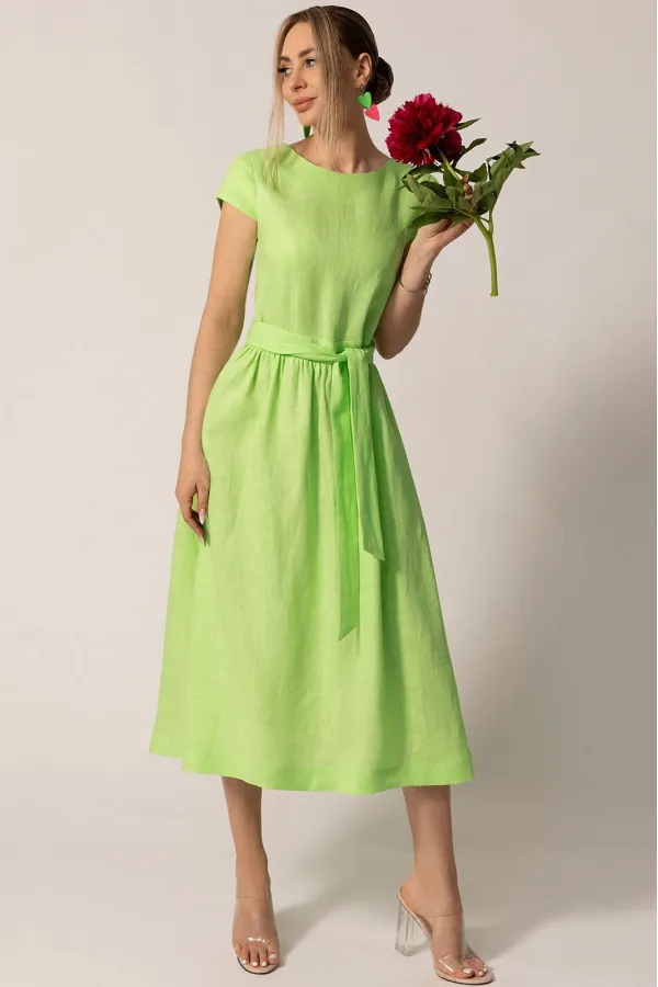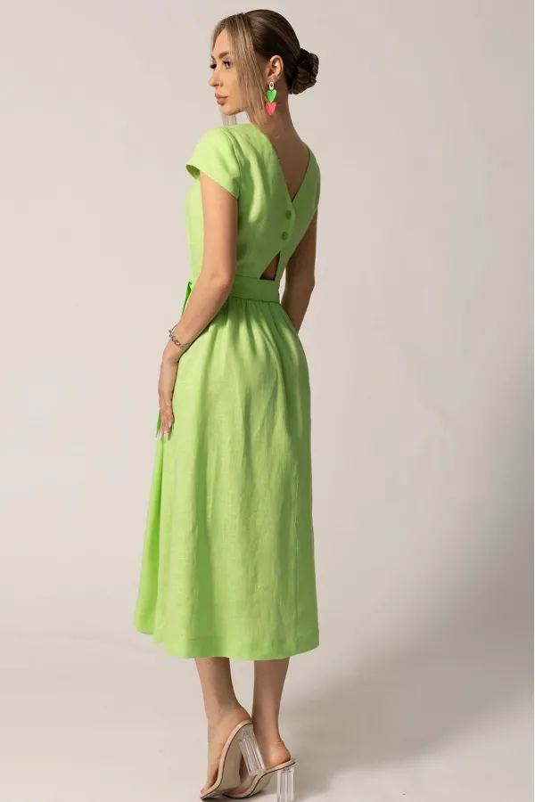 Платье с круглым вырезом горловины, без воротника, застежкой на петли и пуговицы по спинке. Платье отрезное по линии талии, с втачным поясом.
