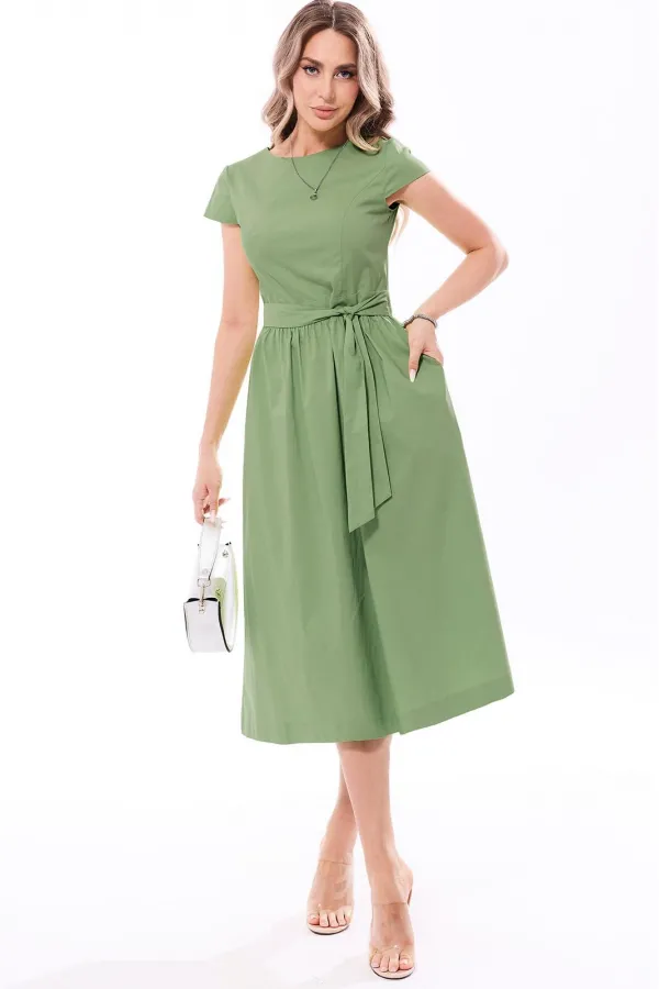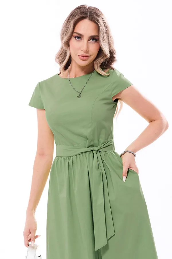 Платье с круглым вырезом горловины, без воротника, застежкой на петли и пуговицы по спинке. Платье отрезное по линии талии, с втачным поясом. Верхняя часть переда с рельефами, выходящими из проймы. Верхняя часть спинки с талиевыми вытачками, фигурным вырезом горловины и фигурным вырезом по низу, застежкой на две петли и пуговицы. Нижняя часть платья со сборкой по шву притачивания к поясу. Рукав втачной, короткий. В боковых швах расположены карманы.