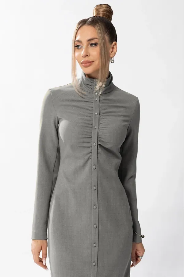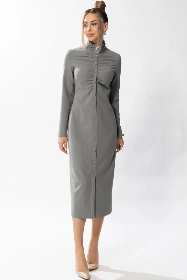 Платье, с центральной застежкой на петли и пуговицы, отрезной стойкой. Полочки и стойка присборены по шву притачивания к планке. Спинка со средним швом и талиевыми вытачками. Рукав втачной, длинный. Платье без подкладки