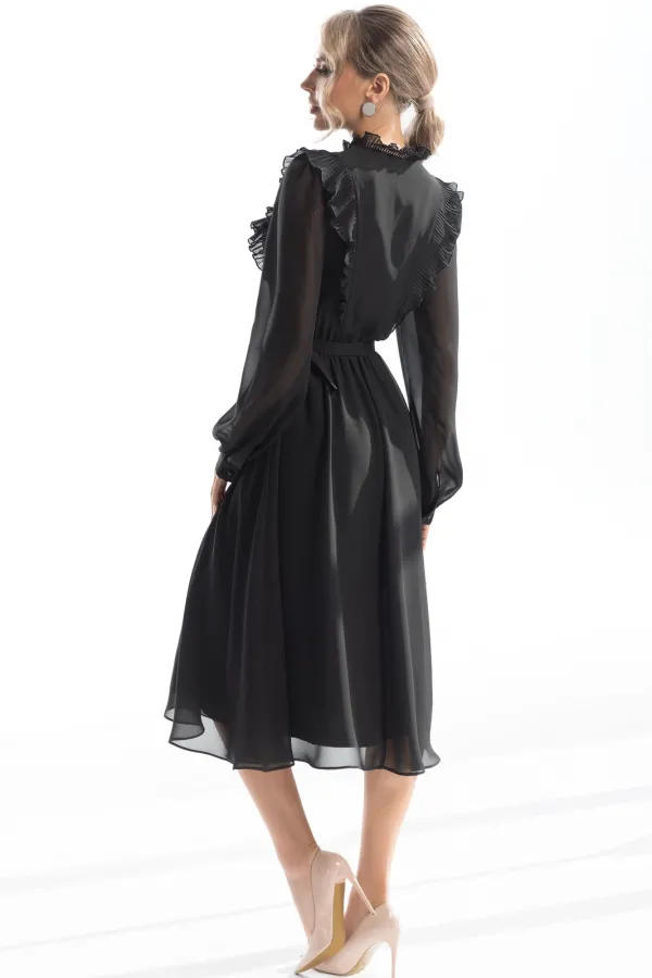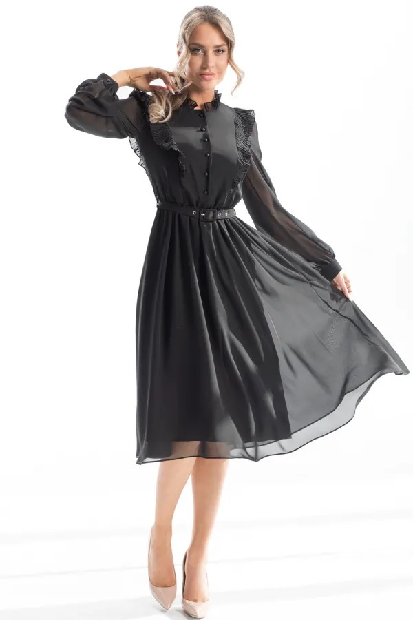 Платье, с воротником- стойкой, центральной застежкой на петли и пуговицы. Платье отрезное по линии талии. Шов по талии присборен на резинку. Верхняя часть переда с рельефами, выходящими из плеча, рюшей, выходящей из рельефов. Верхняя часть спинки с рельефами, выходящими из плеча и рюшей, выходящей из рельефов. Рукав втачной, длинный, с отрезной манжетой. По окату и шву притачивания манжеты рукав присборен. Платье со съемным поясом.