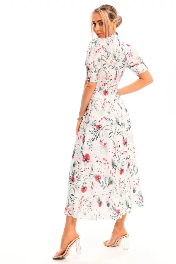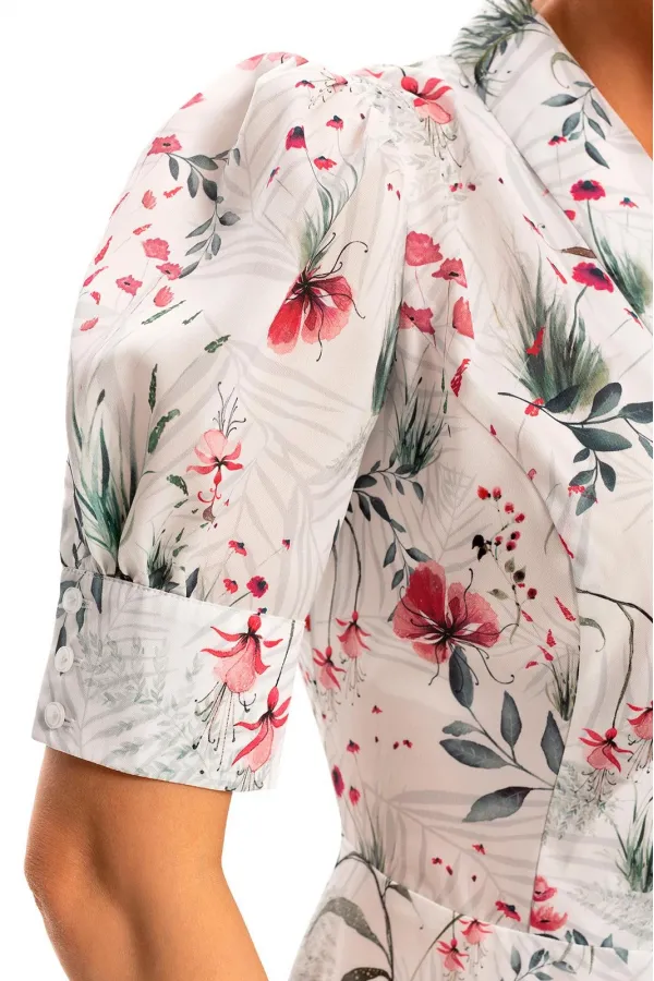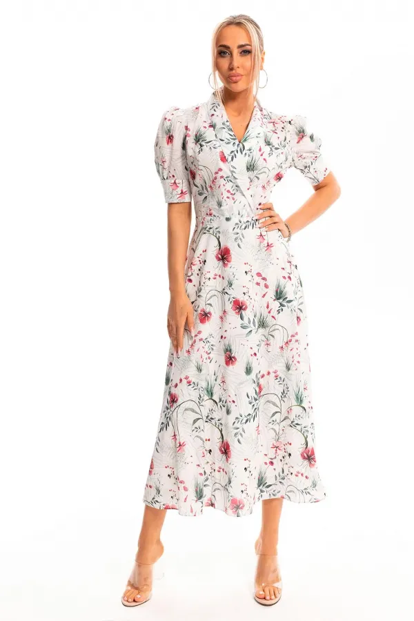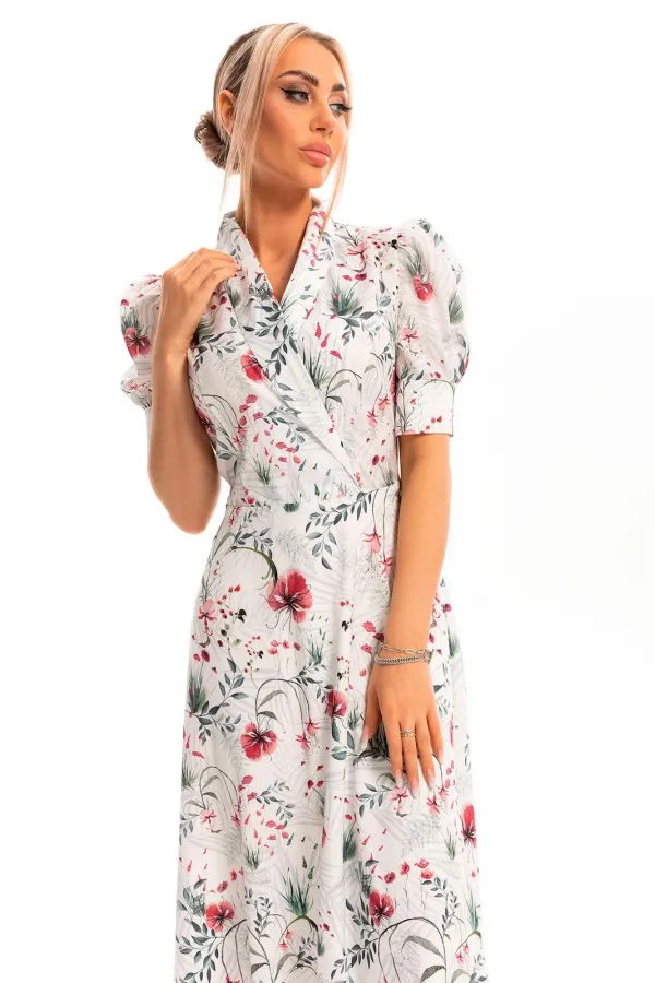 платье с застежкой на потайную молнию в левом боковом шве, отложным воротником- шаль, отрезное по линии талии. Верхняя часть переда платья с рельефами, выходящими из проймы. Верхняя часть спинки платья с талиевыми вытачками. Нижняя часть платья расклешенная. Рукав короткий, с отрезной манжетой. Окат и низ рукава присборен.