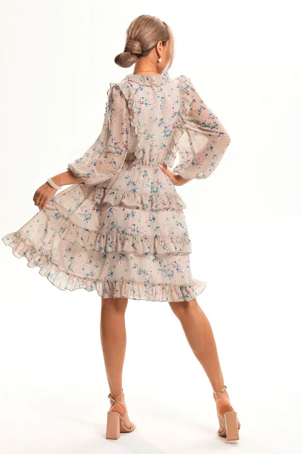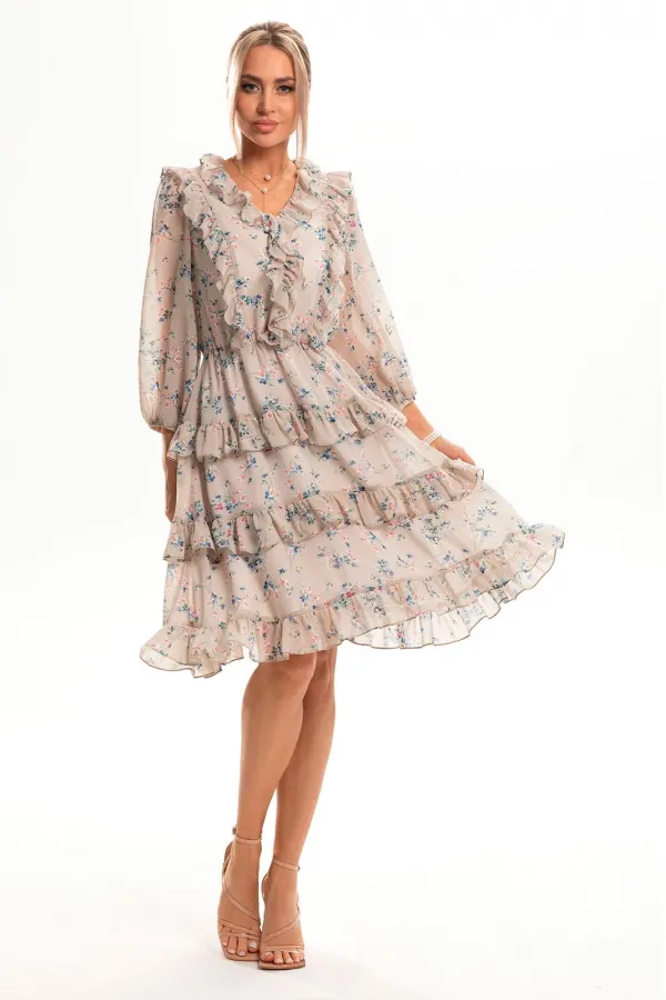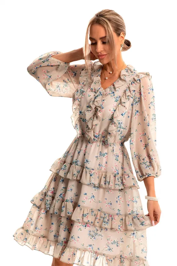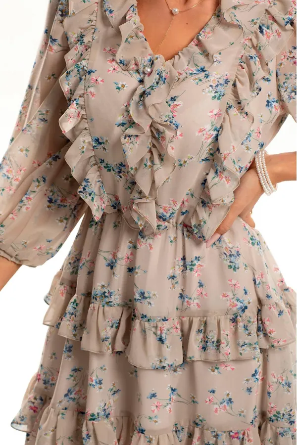 Платье без воротника, с V-образным вырезом горловины. Платье отрезное по линии талии, шов по талии присборен на резинку. Верхняя часть переда с рельефными швами, выходящими из плеча, в рельефные швы вставлены рюши. Верхняя часть спинки с рельефными швами, выходящими из плеча, в рельефные швы вставлены рюши. Нижняя часть платья разделена на три детали с рюшами, выходящими из стачных швов. По горловине переда и спинкии среднему шву переда вставлены рюши. Рукав втачной, 3/4, с отрезной манжетой, присборенной на резинку. По окату рукава -сборка.