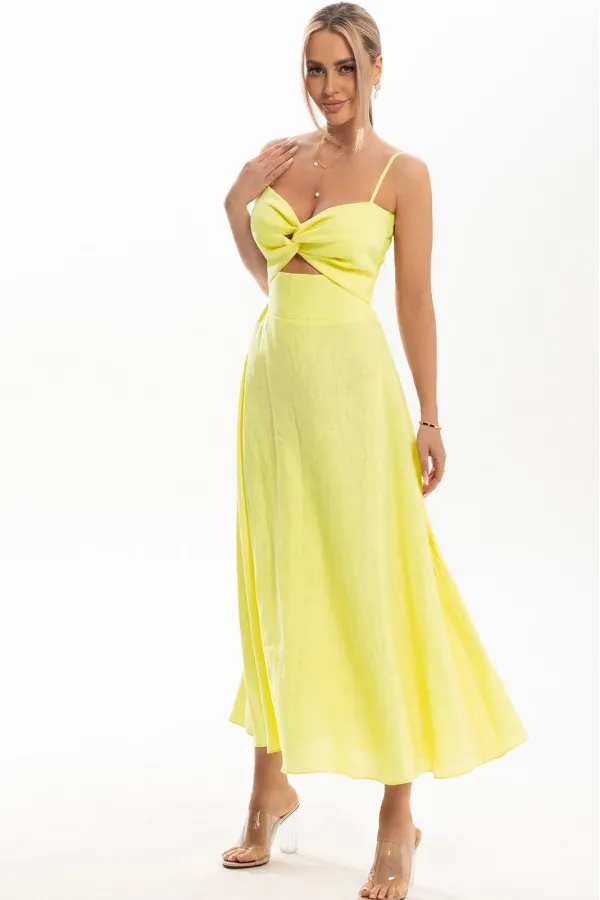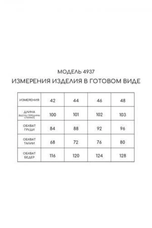 Платье на бретелях, без рукавов и воротника, с застежкой на потайную молнию в среднем шве спинки. Платье отрезное по линии талии. Лиф переда состоит из двух деталей, верхняя часть лифа с перекрученными деталями и отрезной нижней частью. Лиф спинки состоит из двух деталей, боковая деталь спинки присборена резинкой. Нижняя часть платья расклешенная.