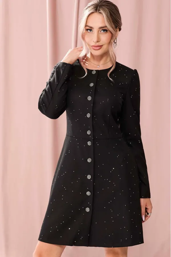 Платье без воротника, с центральной застежкой на петли и пуговицы, с круглым вырезом горловины. Платье отрезное по линии талии. Верхняя часть переда с нагрудными и талиевыми вытачками. Верхняя часть спинки со средним шво... Читать далее...