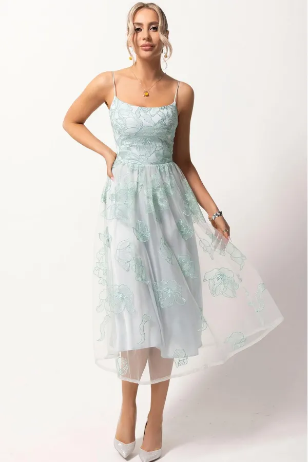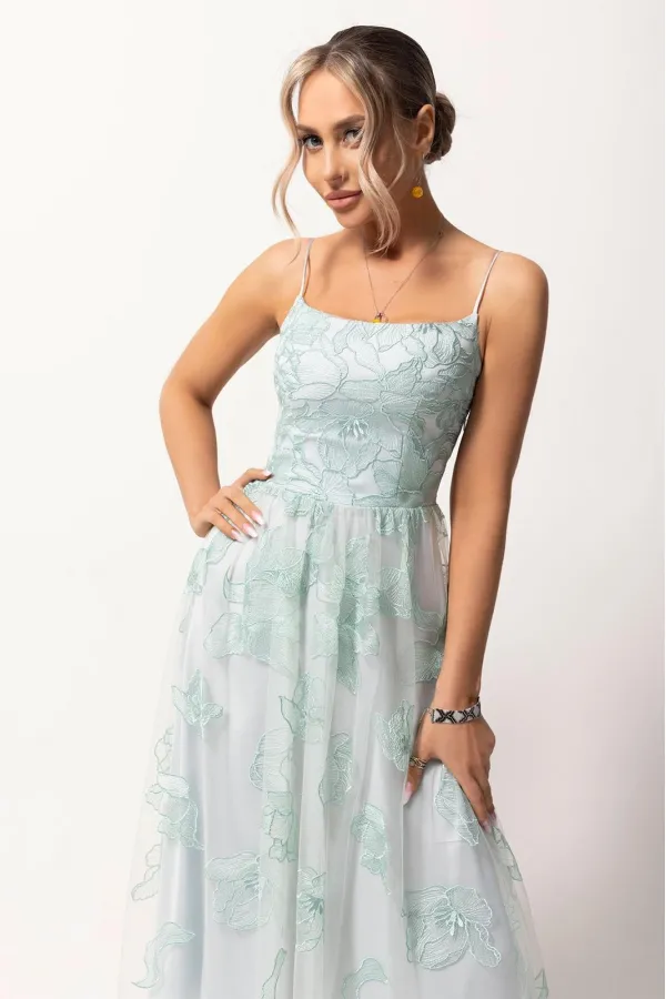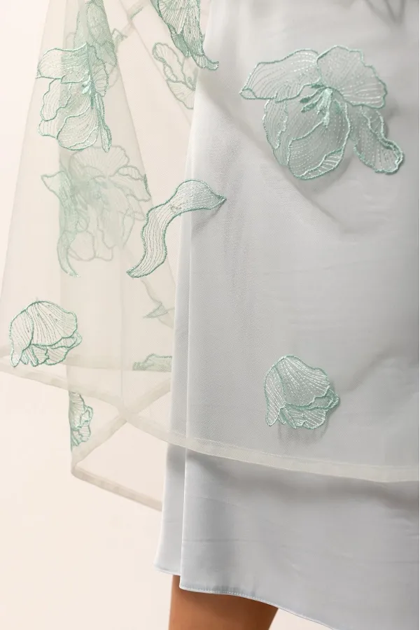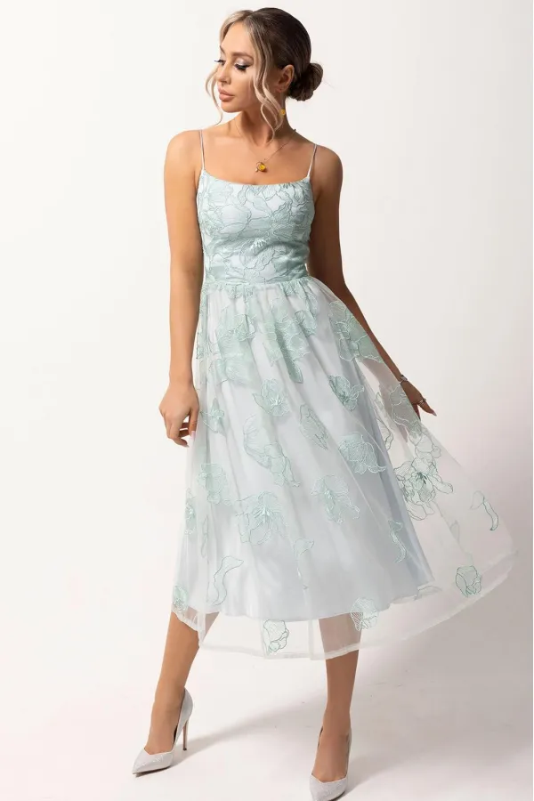 Платье без воротника, на бретелях, двуслойное. с застежкой на потайную молнию в левом боковом шве. Платье отрезное по линии талии. Шов по талии присборен. . Верхняя часть переда с нагрудными и талиевыми вытачками. Верхня... Читать далее...