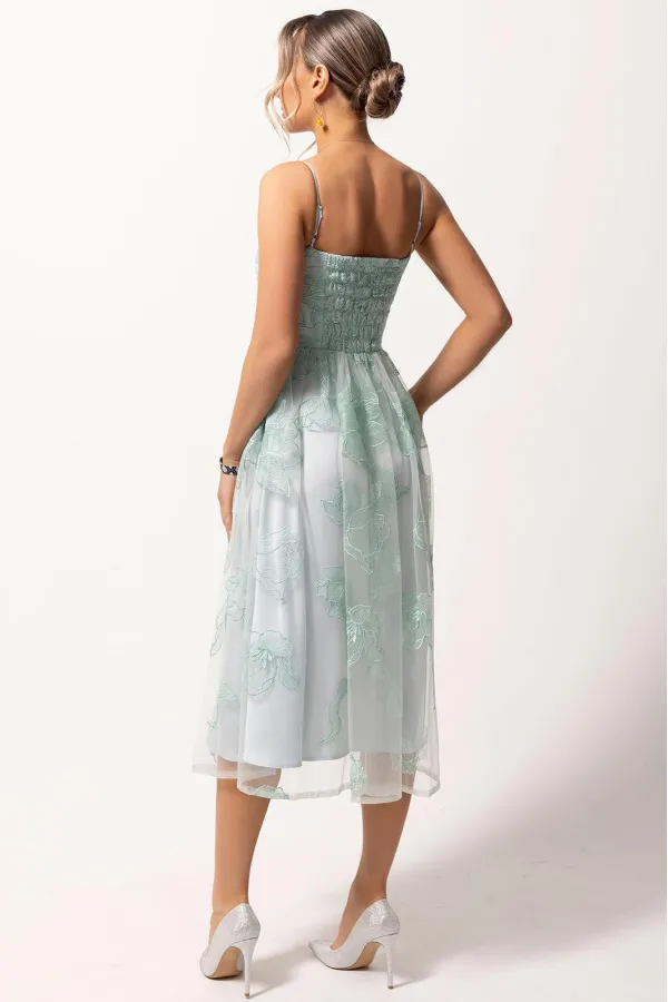 Платье без воротника, на бретелях, двуслойное. с застежкой на потайную молнию в левом боковом шве. Платье отрезное по линии талии. Шов по талии присборен. . Верхняя часть переда с нагрудными и талиевыми вытачками. Верхняя часть спинки с двумя рельефными швами. Средняя часть спинки присборена параллельными строчками на резинку.