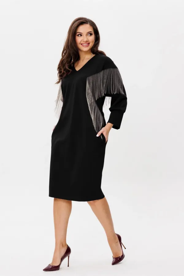 Платье трикотажное, полуприлегающего силуэта. Вырез горловины V-образный, рукав спущенный. В пройму рукава и по переду вставлена декоративная тесьма. По низу рукава манжет. Изделие без застежки, в боковых швах карманы, ... Читать далее...