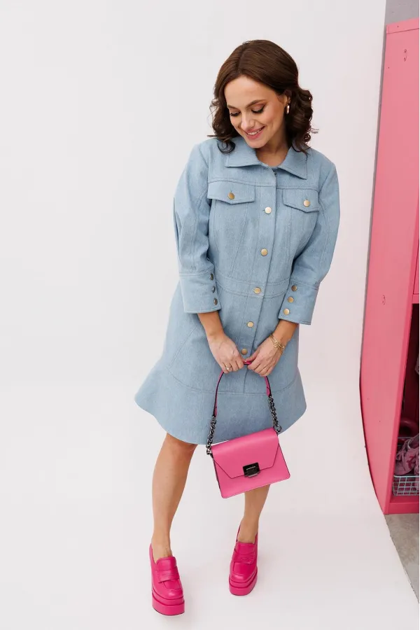 Платье женское полуприлегающего силуэта. Воротник рубашечного типа, рукав втачной на манжете, длина ¾. По переду рельефы, кокетка и клапаны. По низу платья волан. Застежка на петли и пуговицы до волана.