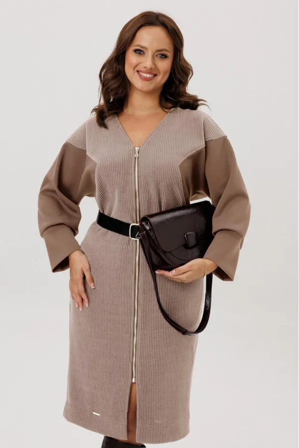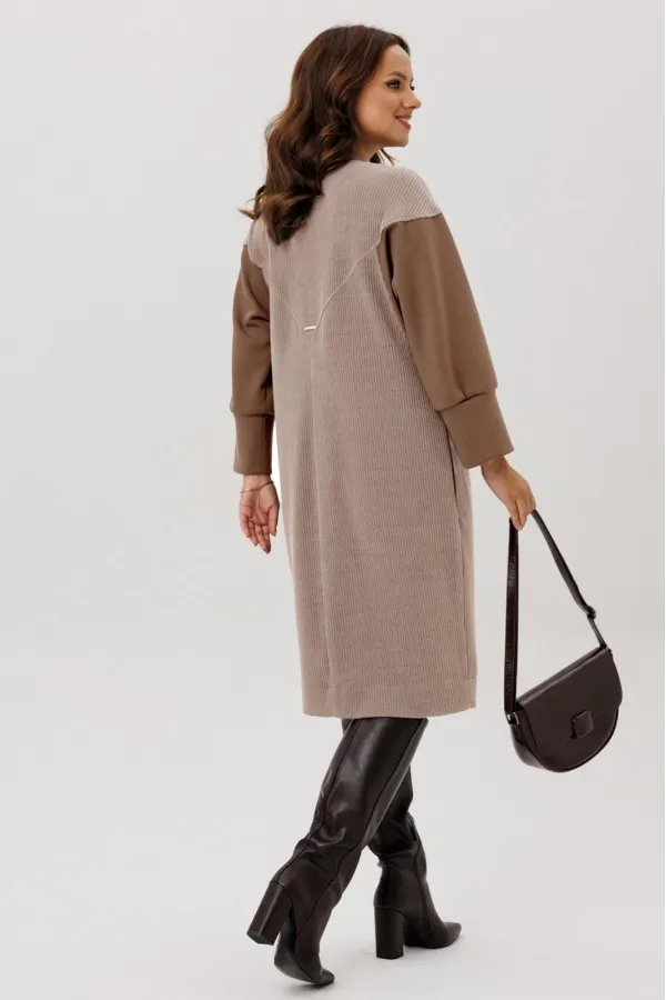 Платье полуприлегающего силуэта, вырез горловины V – образный, рукав цельнокроеный спущенный со вставками из кожи и на манжете внизу. По спинке кокетка, в боковых швах функциональные карманы. Застежка на тесьму-молнию. В комплекте ремень из экокожи.