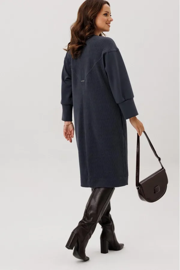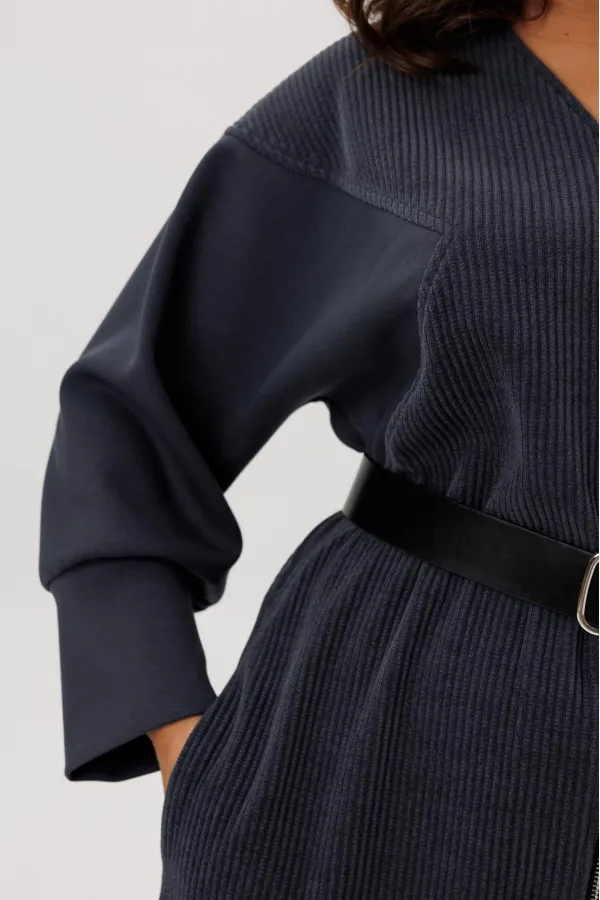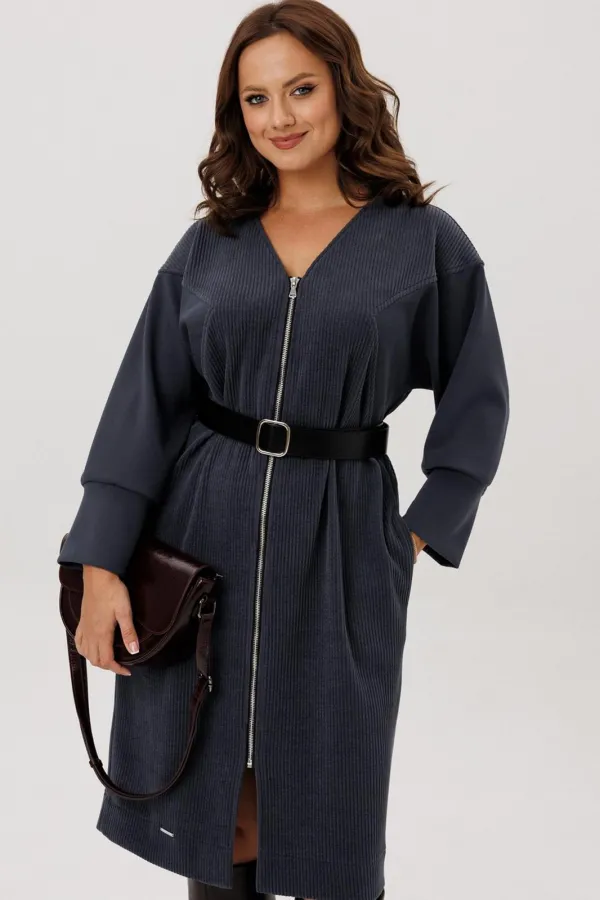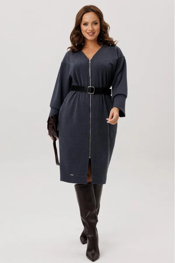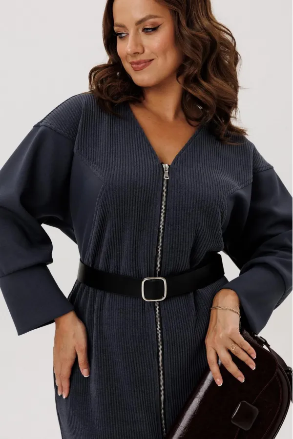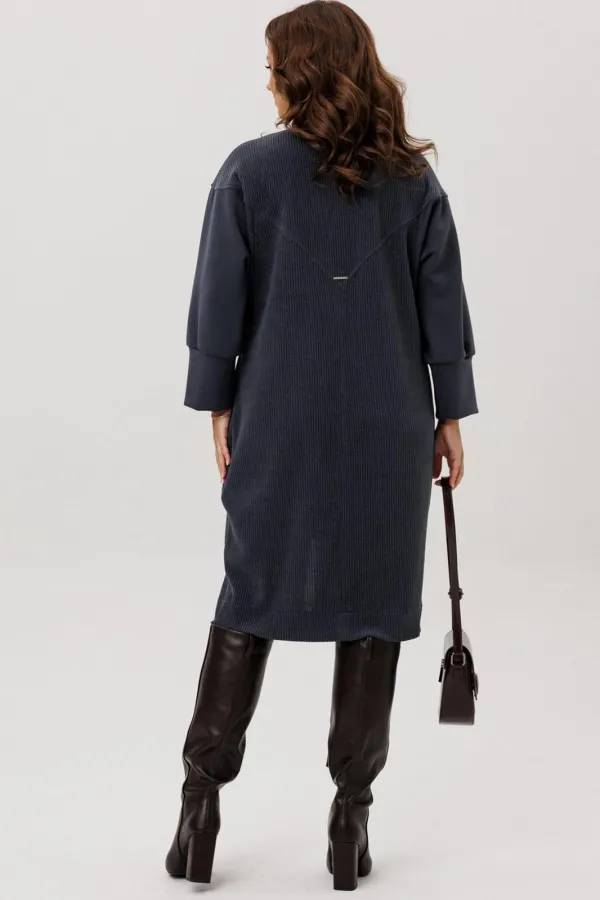 Платье полуприлегающего силуэта, вырез горловины V – образный, рукав цельнокроеный спущенный со вставками из кожи и на манжете внизу. По спинке кокетка, в боковых швах функциональные карманы. Застежка на тесьму-молнию. В комплекте ремень из экокожи.