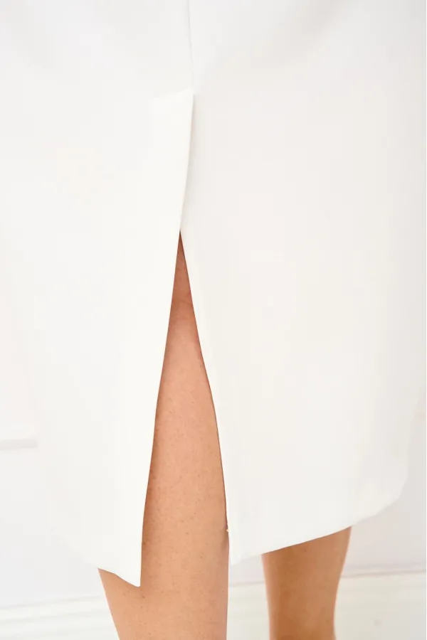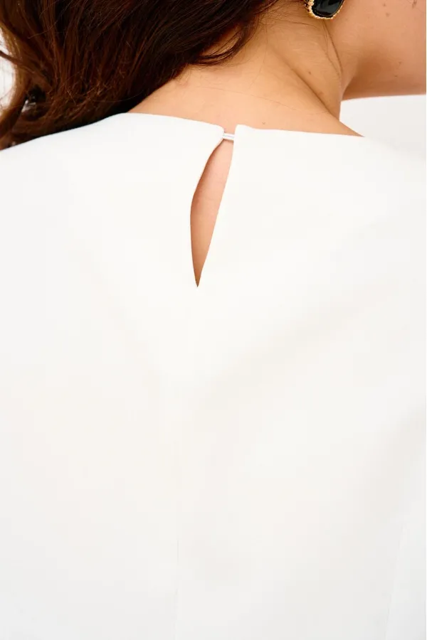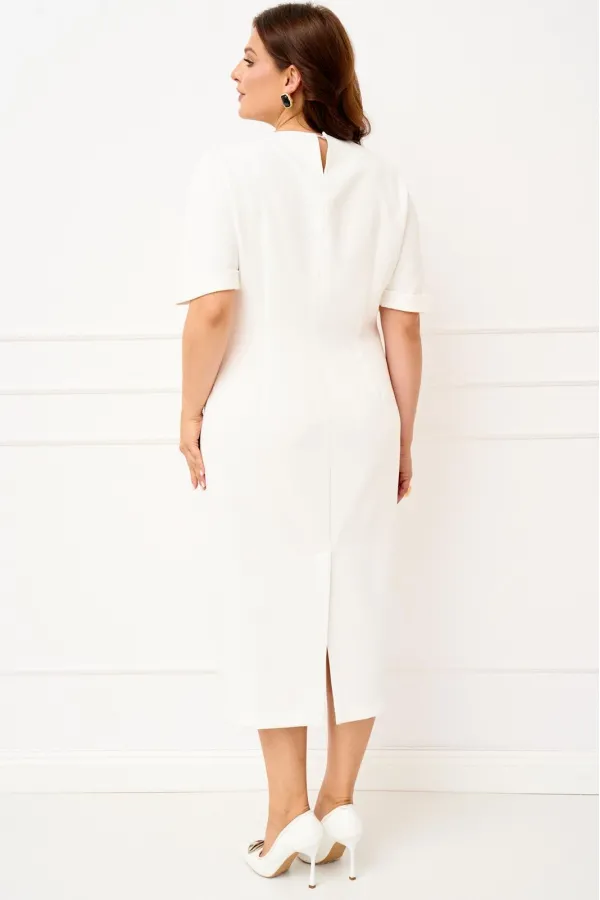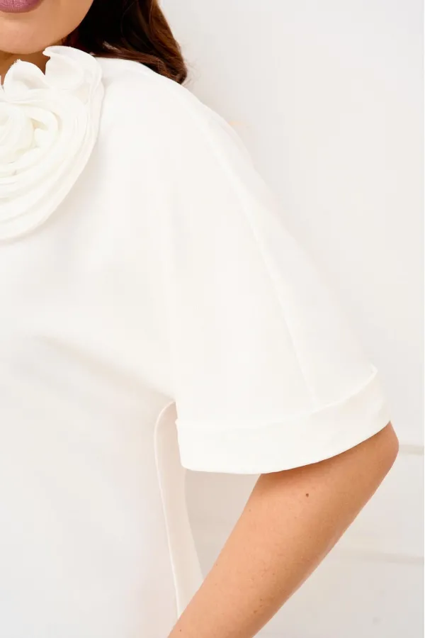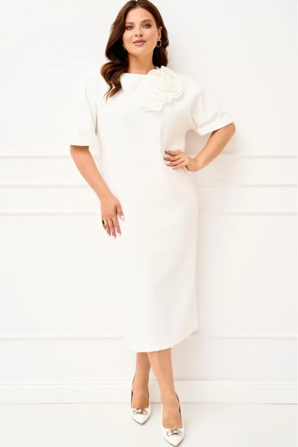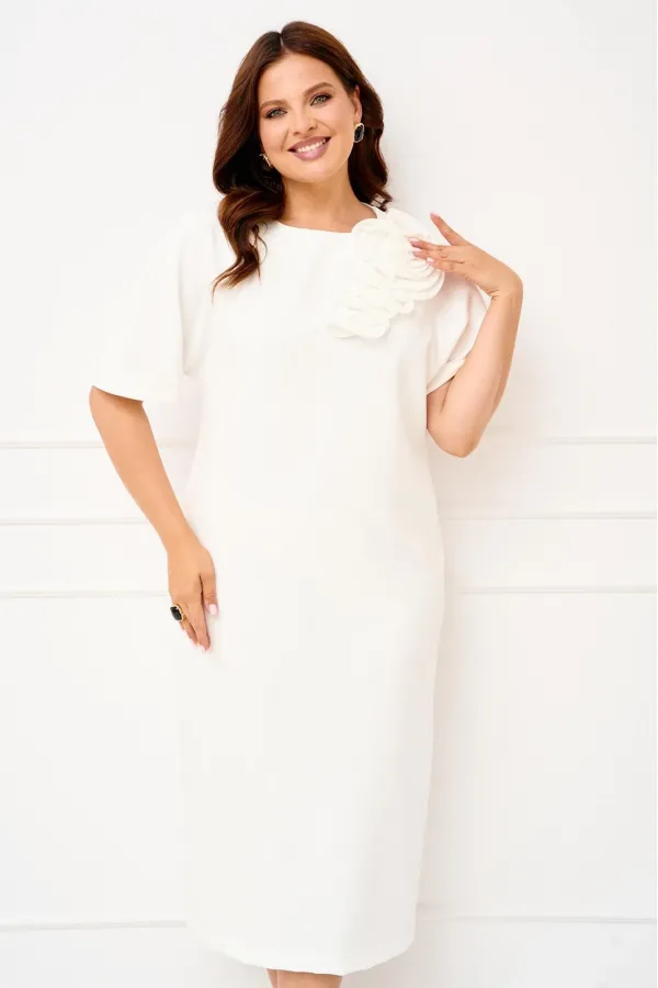 Женское платье полуприлегающего силуэта выполнено из плательной ткани со втачными рукавами и декоративным несъемным цветком; по спинке вырез в виде капельки, который застегивается на петлю и пуговицу; по низу - шлица.