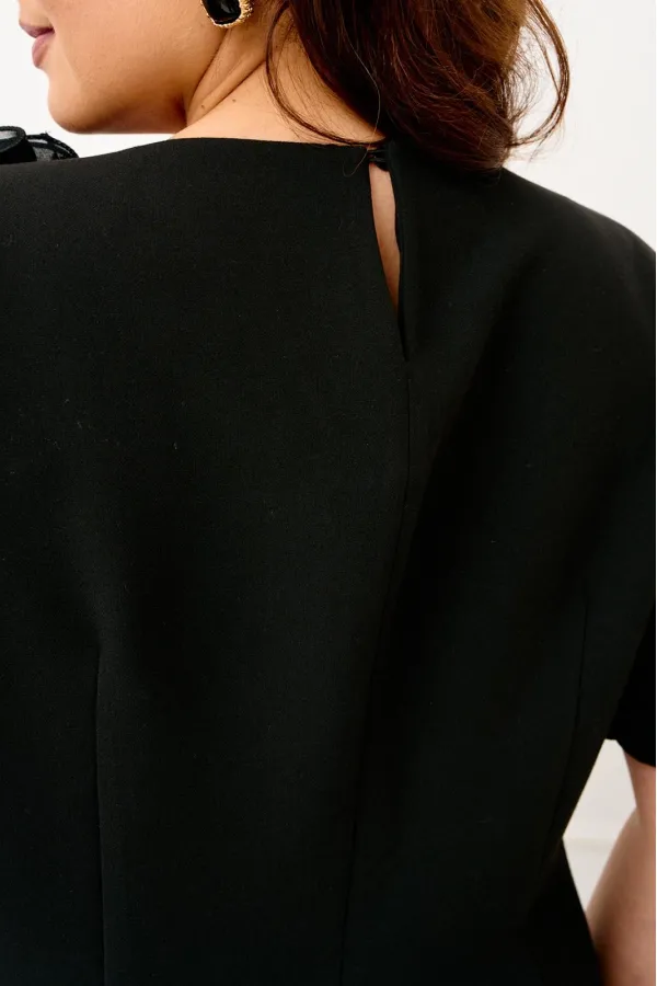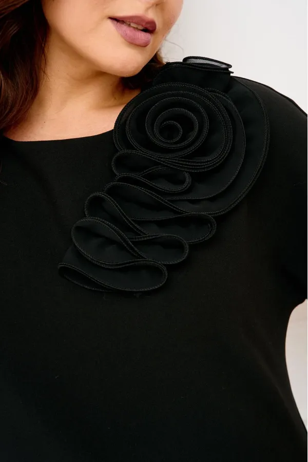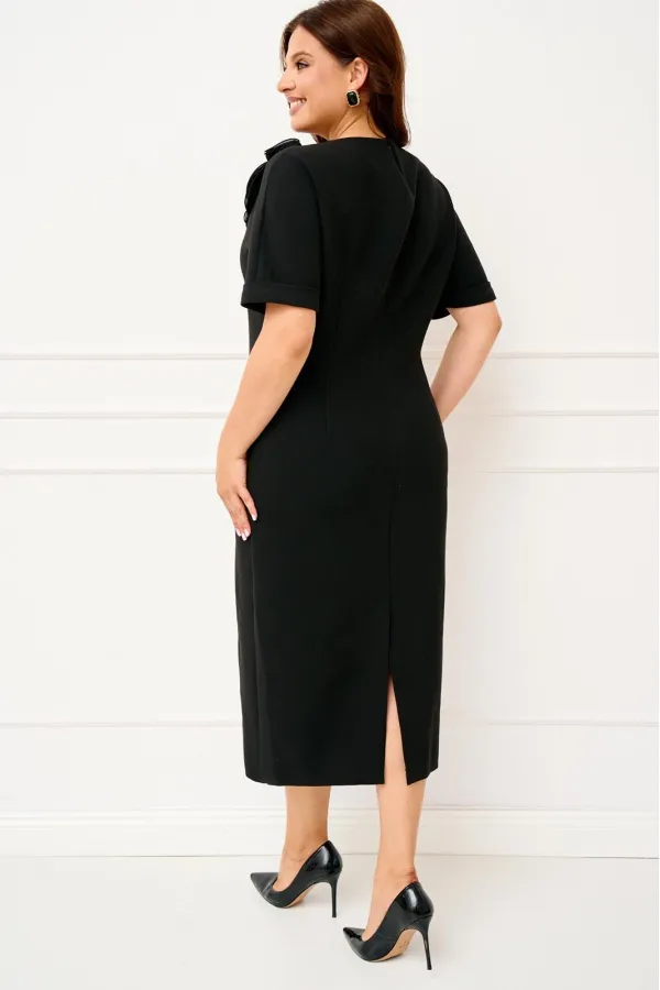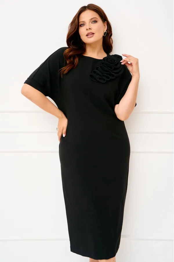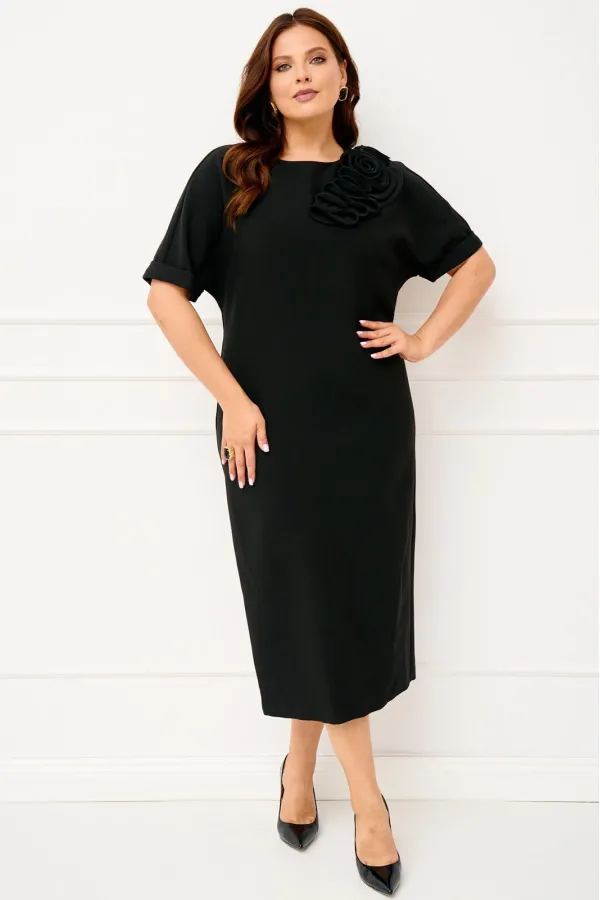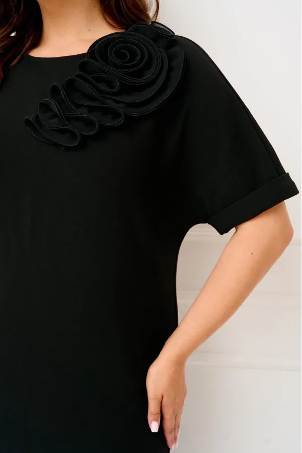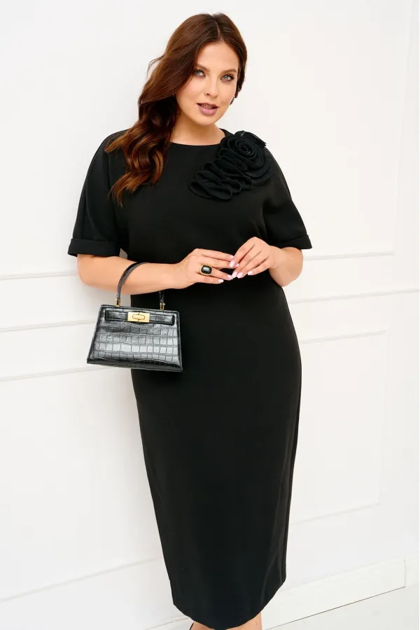Женское платье полуприлегающего силуэта выполнено из плательной ткани со втачными рукавами и декоративным несъемным цветком; по спинке вырез в виде капельки, который застегивается на петлю и пуговицу; по низу - шлица.