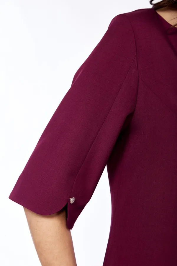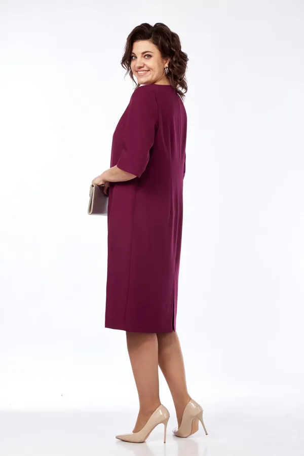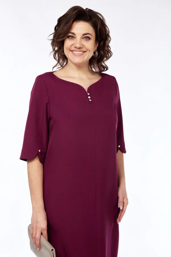 Платье женское, нарядное полуприлегающего силуэта. Выполнено из плательной ткани. Горловина фигурной формы обработана обтачкой. Перед с нагрудными вытачками и средним швом в котором имеется разрез. Спинка со средним швом и талиевыми вытачками. Рукава втачные, одношовные с небольшим разрезом по шву. Платье декорировано пуговицами.