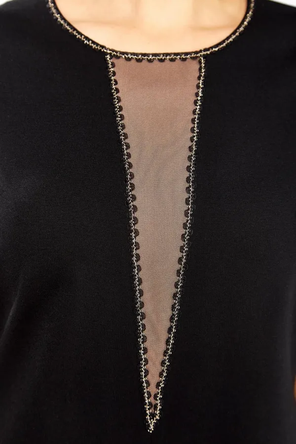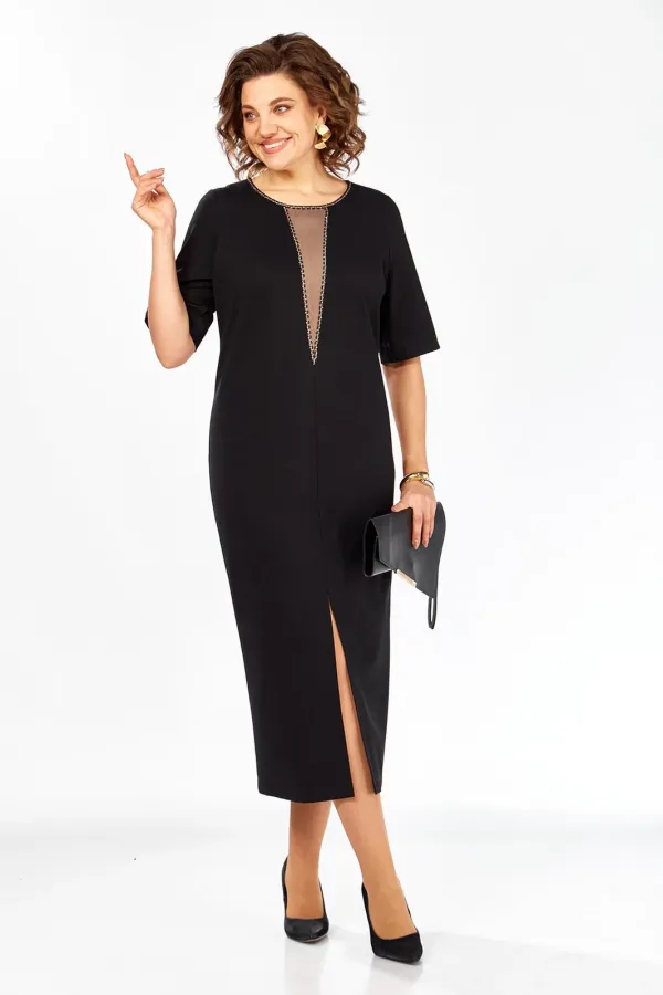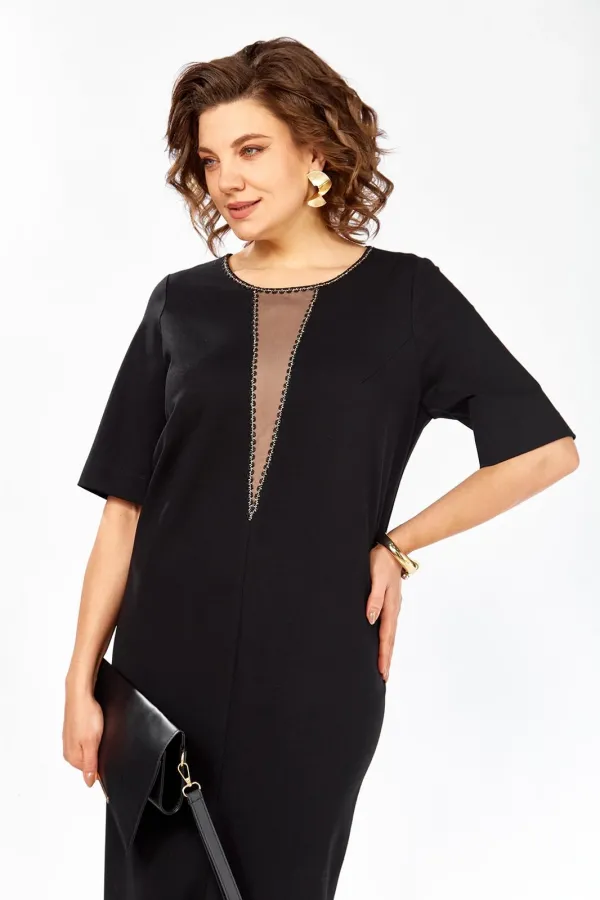 Платье женское, нарядное, полуприлегающего силуэта выполнено из трикотажного полотна. Горловина круглой формы. По переду обработаны нагрудные вытачки и фигурная вставка из отделочной ткани. По горловине и вставке декора... Читать далее...