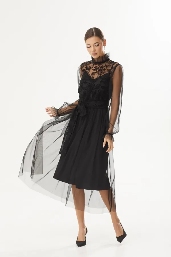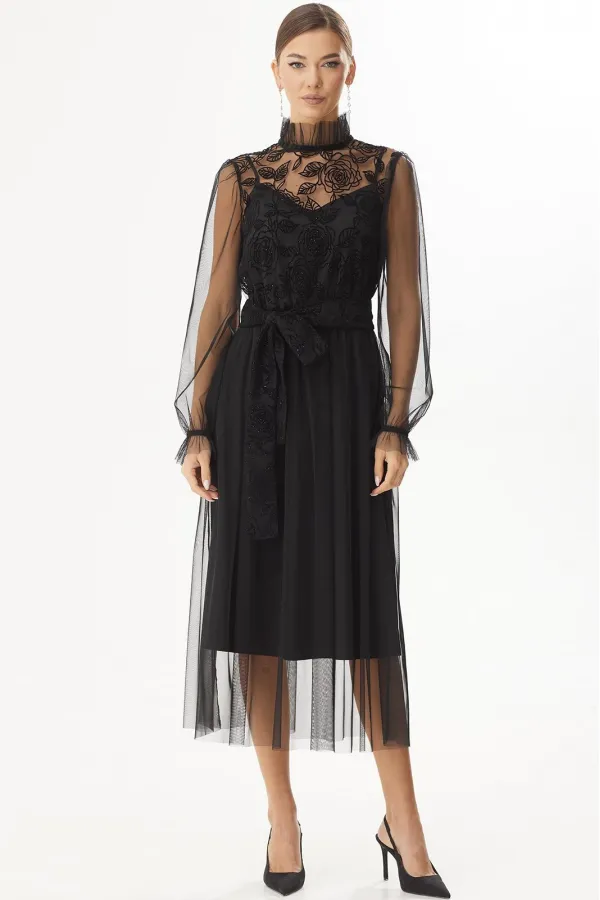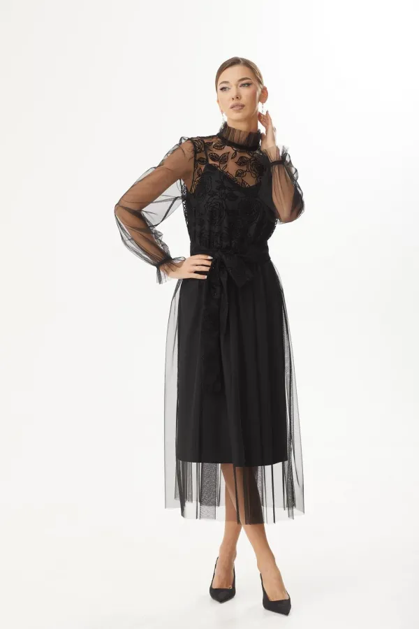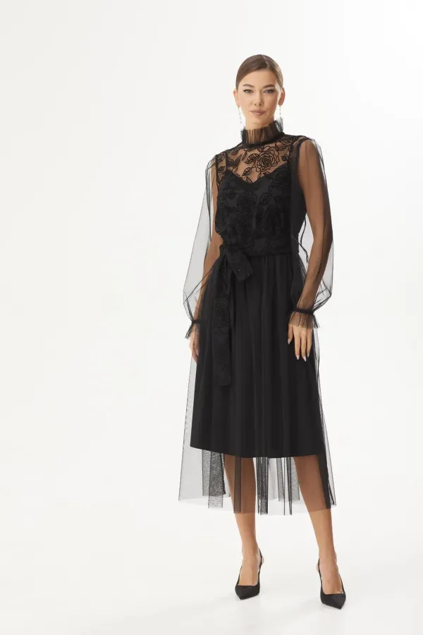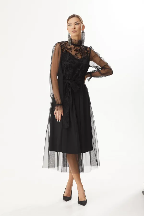 Платье двухслойное полуприлегающего силуэта, отрезное по линии талии. Верхний лиф выполнен из фатина с флоком. Перед и спинка цельнокроеные. В области горловины обработана застежка-капелька на навесную петельку и пуговицу. Нижняя юбка прямая, верхняя юбка собрана по линии талии. Рукав длинный, втачной, по низу оборка, на запястье просборен на резинку. Горловина округлой формы, декорирована тесьмой. В комплекте съемный пояс.