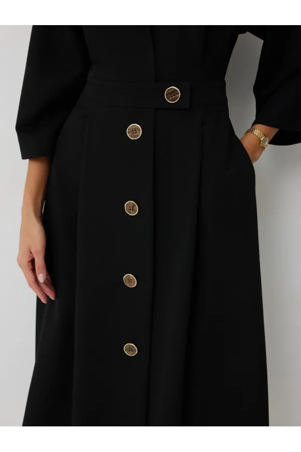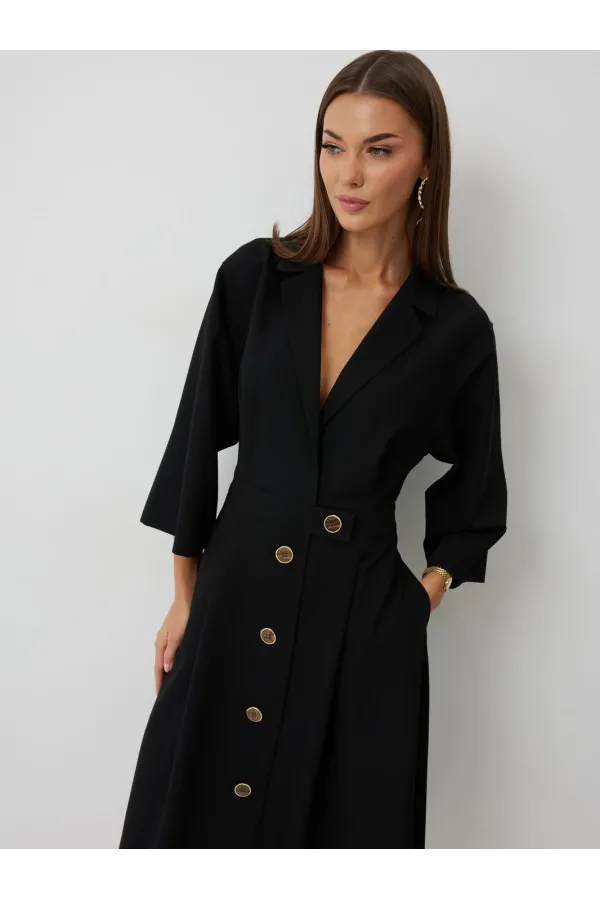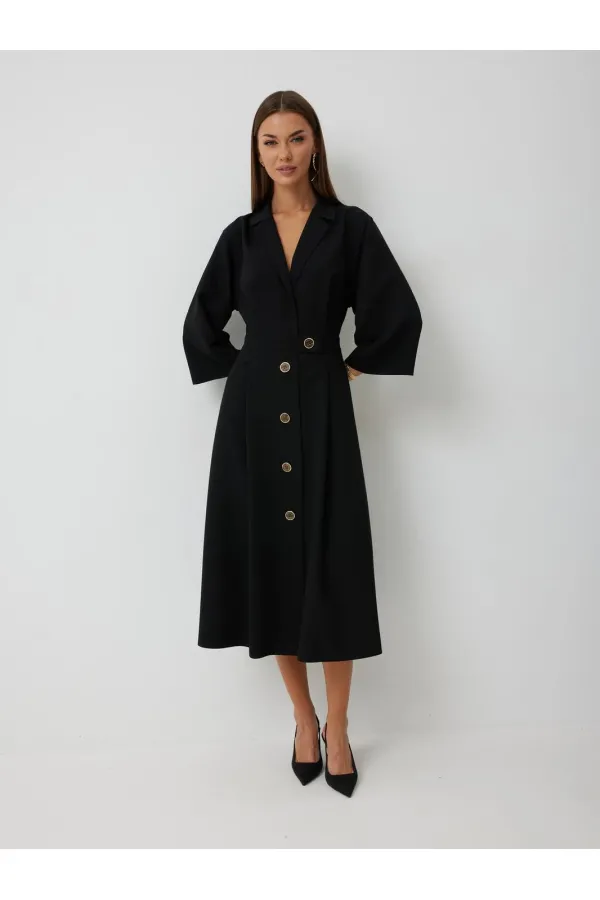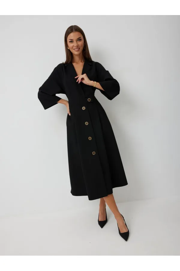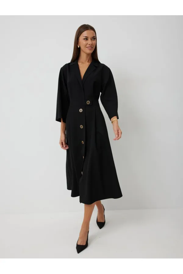 Платье женское полуприлегающего силуэта, отрезное по линии талии с застежкой по центральной части переда на декоративные пуговицы. Платье длиной до середины икры. По отрезному лифу с юбке полочки и спинки заложены складки. Лиф с юбкой соединены втачным поясом, по которому прострочена отделочная строчка. Рукав втачной прямой до середины локтя. По пройме прострочена отделочная строчка. Горловина платья обработана втачным воротником с отложными лацканами.